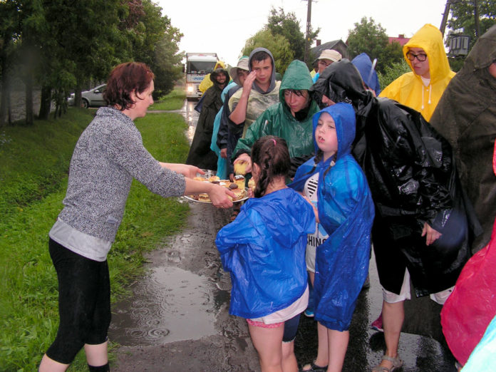 Mieszkańcy wsi Wierzbica w gminie Kozłów jak co roku gościli przemyskich pielgrzymów. Jak widać na zdjęciu, aura nie przywitała ich pobłażliwie. Jednak dzięki paniom z Koła Gospodyń Wiejskich z Kozłowa nawet strugi ulewnego deszczu nie przeszkodziły w rozczęstowaniu hektolitrów napojów, 17 ciast, 120 bułek, słodyczy i innych smakołyków. Z pomocą chętnie pospieszył również wójt gminy Kozłów.