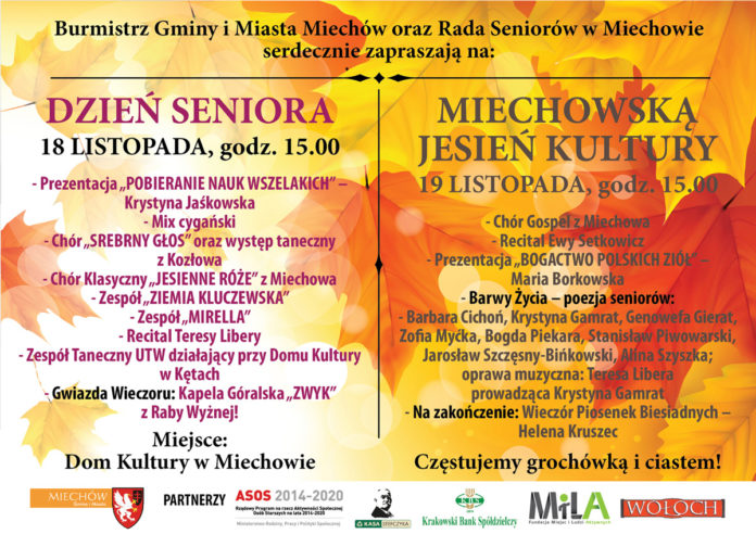 Burmistrz Gminy i Miasta Miechów oraz Rada Seniorów serdecznie zapraszają na Dzień Seniora oraz Miechowską Jesień Kultury, które odbędą się w dniach 18 – 19 listopada 2016 r. w Miechowie.