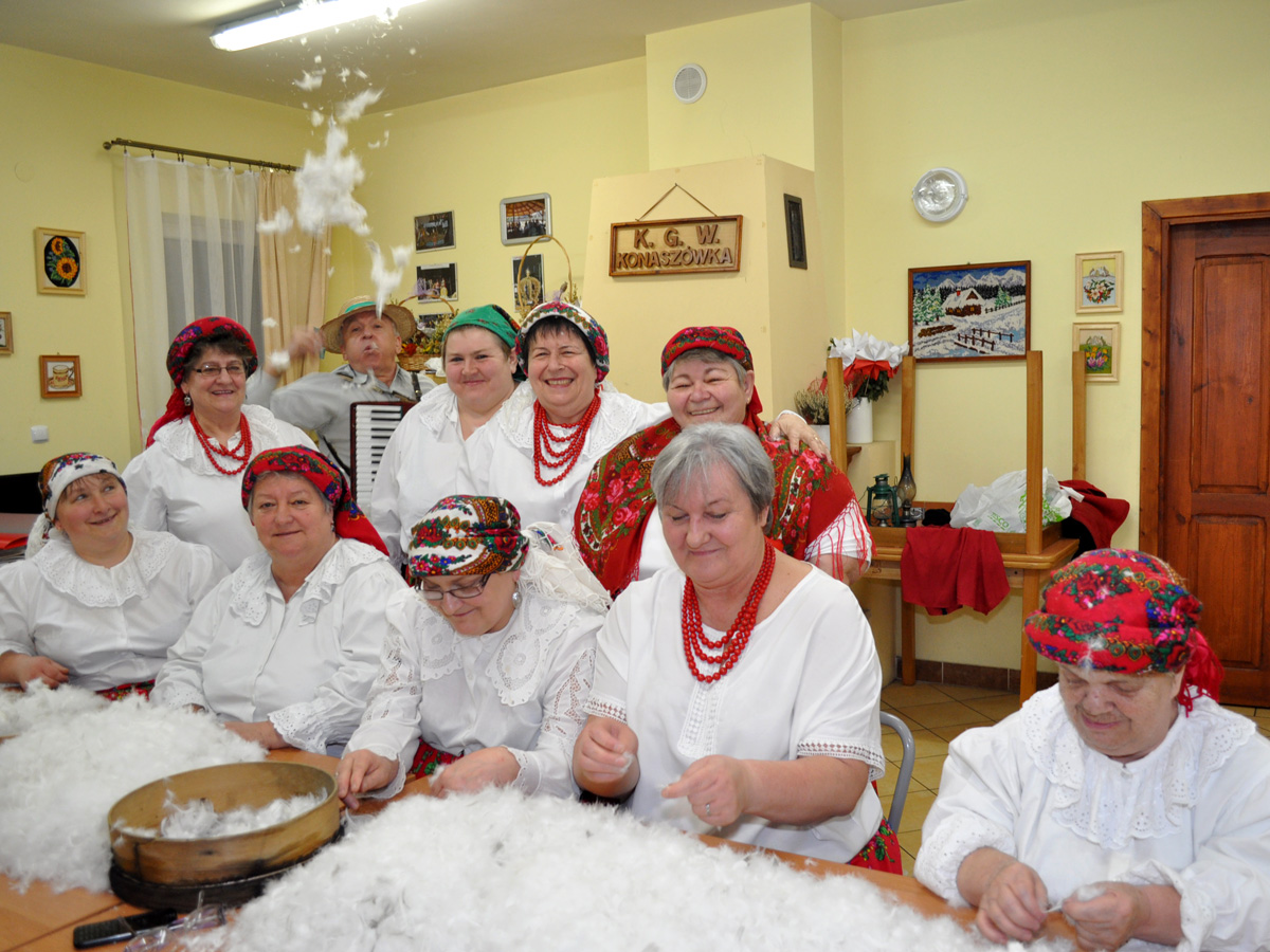 Zwyczaj darcia pierza w Konaszówce kultywują Panie z KGW: Danuta Topolska, Elżbieta Rachwał, Ewa Otak, Stanisława Kubuśka, Łucja Garbarz, Jolanta Łucka, Teresa Kmera, Beata Burzyńska, Aneta Zdeb.