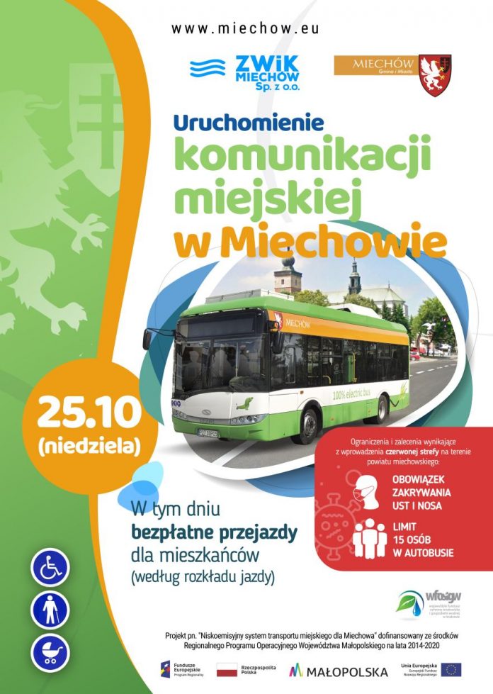 W niedzielę 25 października w Miechowie oficjalnie w trasy kursowe ruszają autobusy miejskie. Tego dnia burmistrz, przy zachowaniu reżimu sanitarnego, zaprasza na bezpłatne przejazdy. Szczegóły na plakacie.
