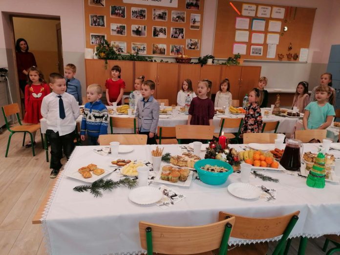 Dzieci od kilku tygodniu ćwiczyły na zajęciach edukacyjnych i na religii z Anną Kowal śpiewanie kolęd i pastorałek. Wspólnie z wychowawcą zaprosiły na spotkanie pracowników szkoły i panią dyrektor Małgorzatę Borycką. Przy akompaniamencie pani Ani na akordeonie zaprezentowały swoje umiejętności. Dzieci wspaniale się przygotowały, nauczyły się tekstu, śpiewały głośno, melodyjnie, do niektórych kolęd zaprezentowały nawet małą choreografię.