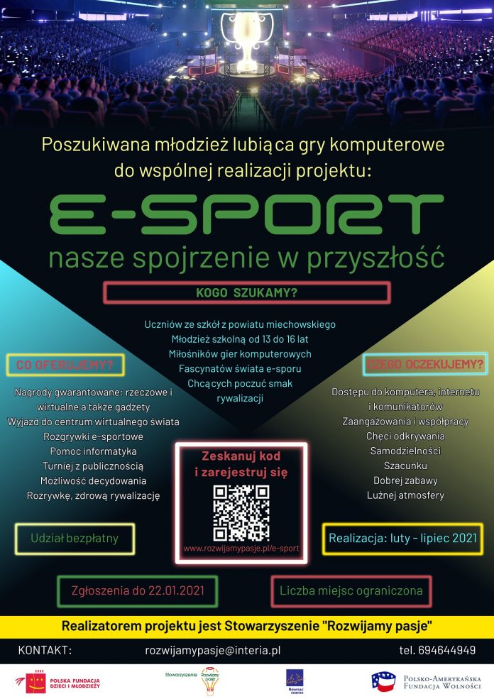 Stowarzyszenie „Rozwijamy Pasje” serdecznie zaprasza młodych ludzi w wieku 13-16 lat do udziału w bardzo ciekawym projekcie skierowanym dla młodzieży pn. „E-sport – nasze spojrzenie w przyszłość”. Projekt finansowany przez Polsko-Amerykańską Fundację Wolności oraz Polską Fundację Dzieci i Młodzieży w ramach Programu „Równać Szanse”.