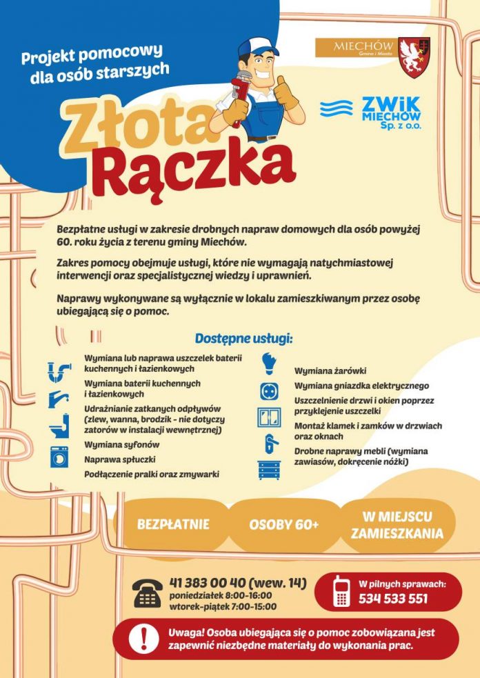 Gmina Miechów uruchomiła projekt wsparcia osób starszych pn. „Złota Rączka”. Z bezpłatnych usług w zakresie drobnych napraw domowych mogą skorzystać mieszkańcy gminy Miechów powyżej 60. roku życia.