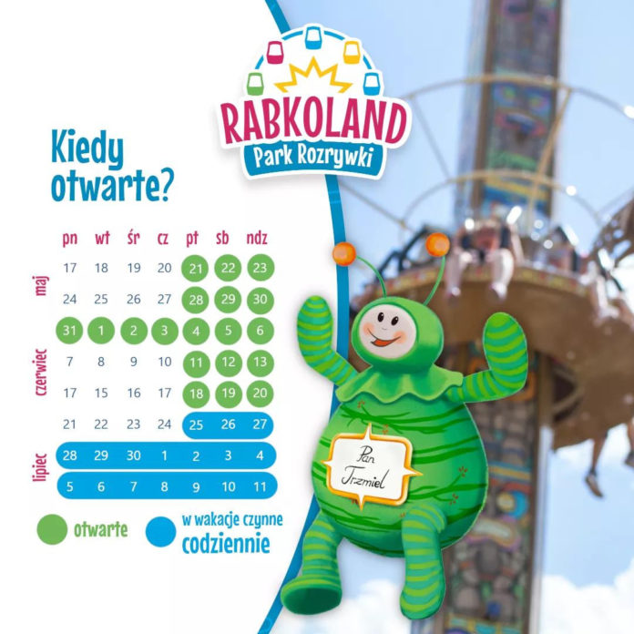 Do końca roku szkolnego Rabkoland otwarty jest w każdy piątek, sobotę i niedzielę w godz. 10:00-18:00. Między 28 maja a 6 czerwca zapraszamy na Tydzień Dziecka! Park rozrywki będzie czynny także w dni powszednie. Od początku wakacji Rabkoland będzie czynny codziennie, siedem dni w tygodniu, w tych samych godzinach.