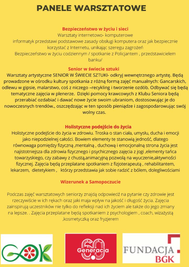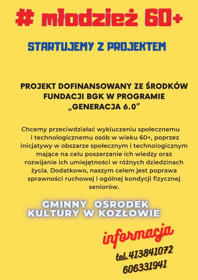 Za pomocą projektu „Młodzież 60+”, Gminny Ośrodek Kultury w Kozłowie przeciwdziała wykluczeniu społecznemu i technologicznemu osób w wieku 60+, poprzez inicjatywy w obszarze społecznym i technologicznym, mające na celu poszerzanie ich wiedzy oraz rozwijanie ich umiejętności w różnych dziedzinach życia. Dodatkowo celem jest poprawa sprawności ruchowej i ogólnej kondycji fizycznej seniorów. Szczegóły na plakatach.