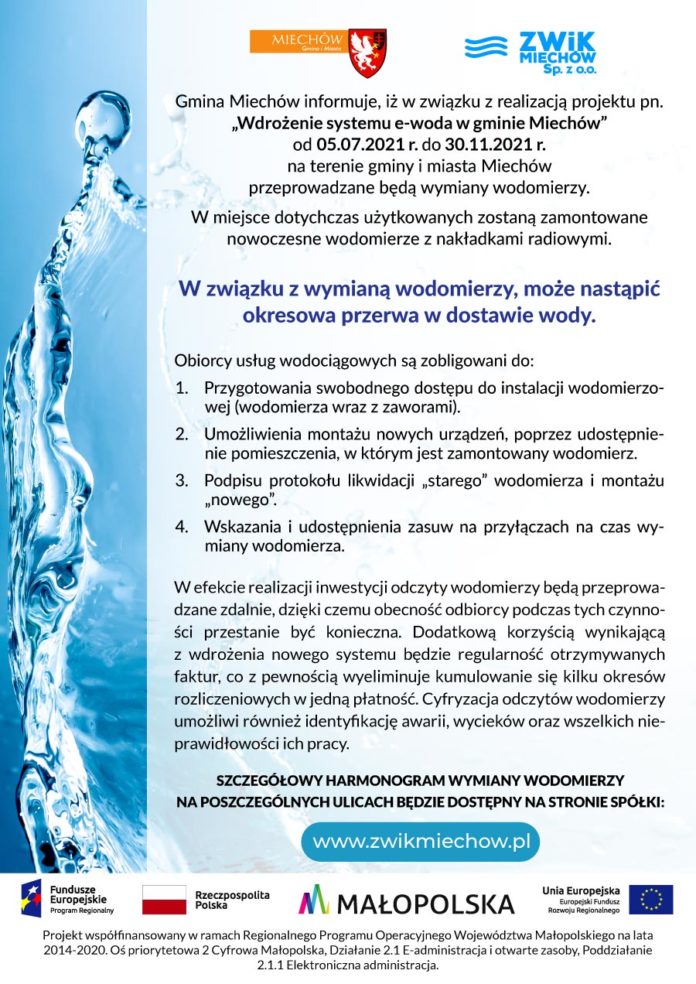 Gmina Miechów informuje, iż w związku z realizacją projektu pn. „Wdrożenie systemu e-woda w gminie Miechów” od 05.07.2021 r. do 30.11.2021 r. na terenie gminy i miasta Miechów przeprowadzane będą wymiany wodomierzy. W miejsce dotychczas użytkowanych zostaną zamontowane nowoczesne wodomierze z nakładkami radiowymi.