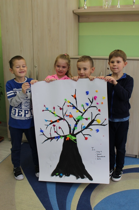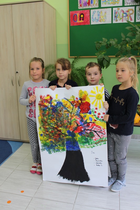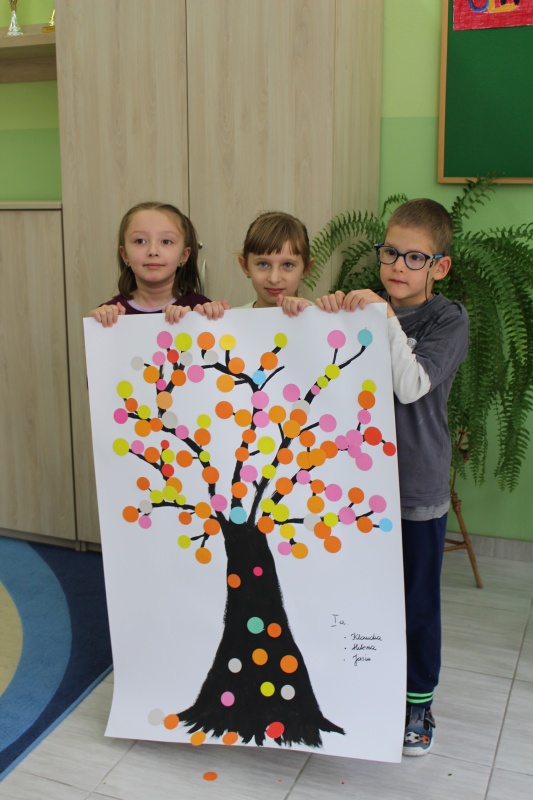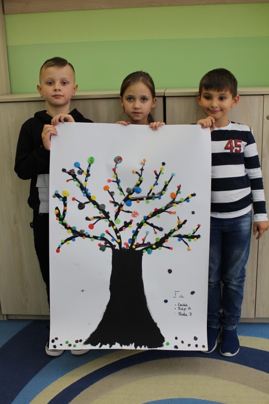 Zainspirowani tą historią, dzieci z I a stworzyły własne kropkowe dzieła. Głównym tematem była kropka w odsłonie jesiennej. Kropkowe drzewa zostały wykonane różnymi technikami min: z bibuły, plasteliny, kropek z dziurkacza, kropkami z farby oraz dużymi kropkami z kolorowego papieru. Efekty pracy uczniów będą prezentowane w bibliotece do końca października.