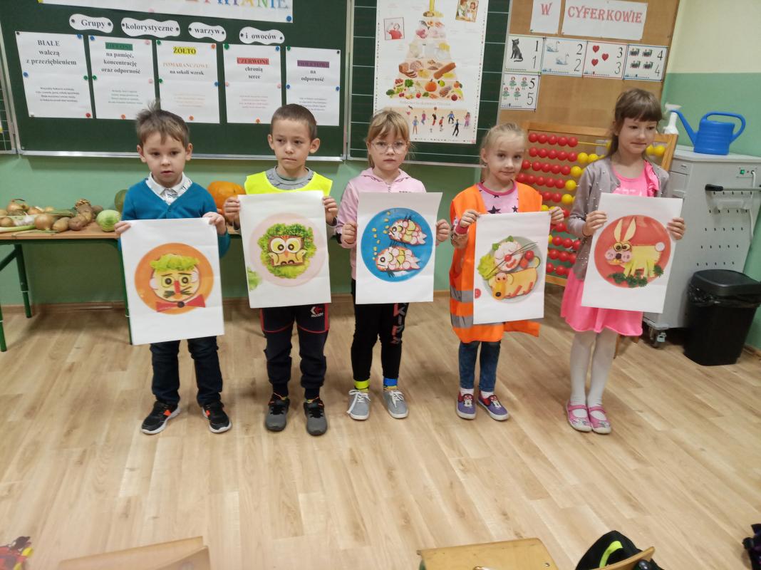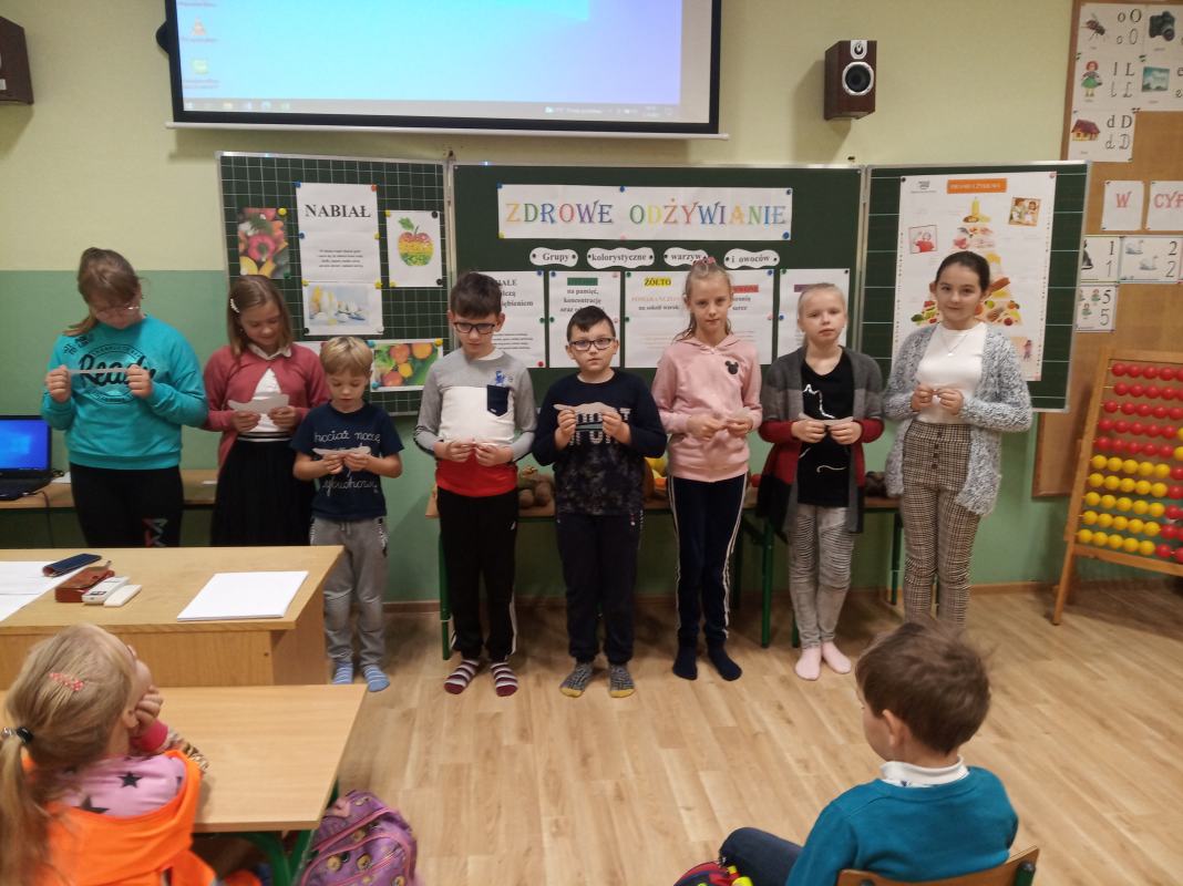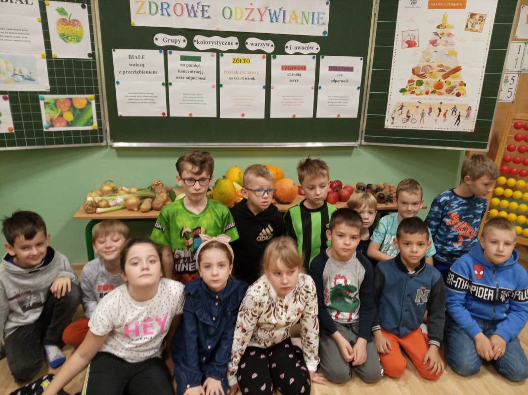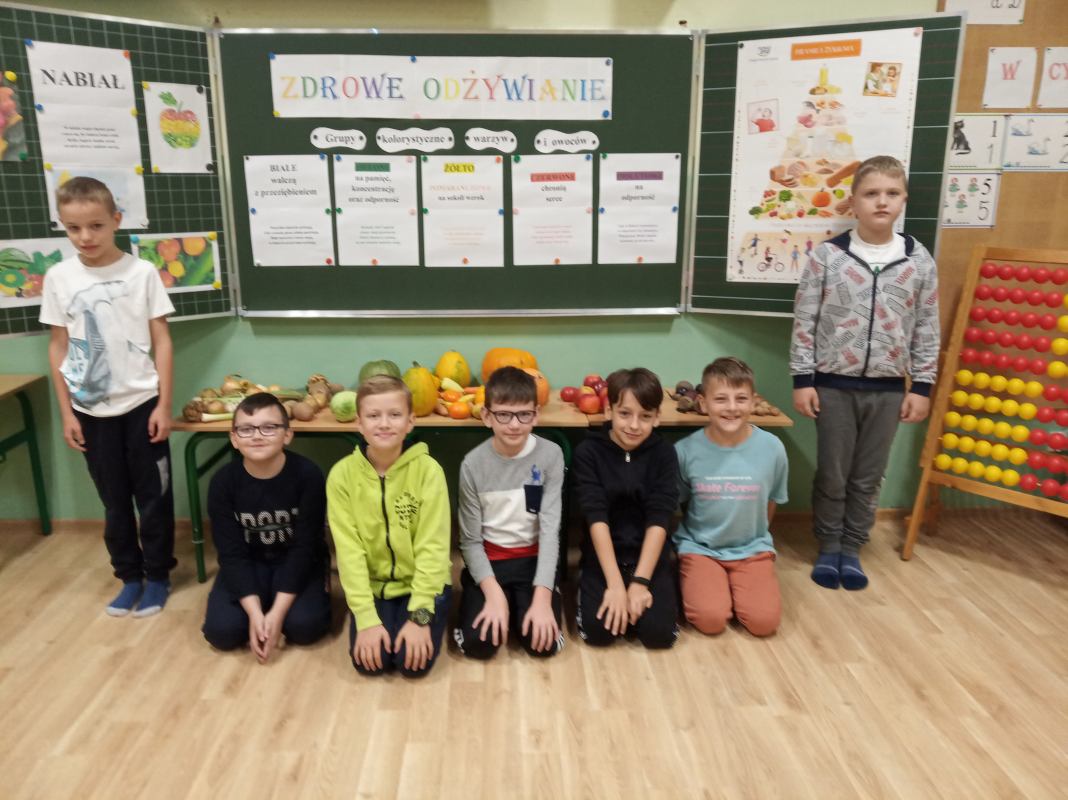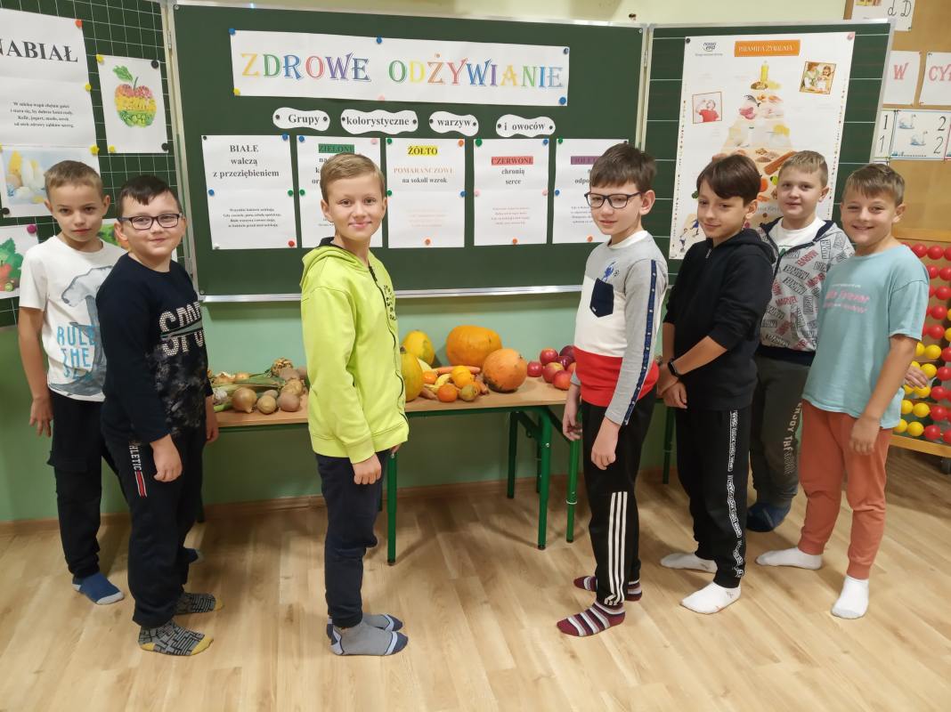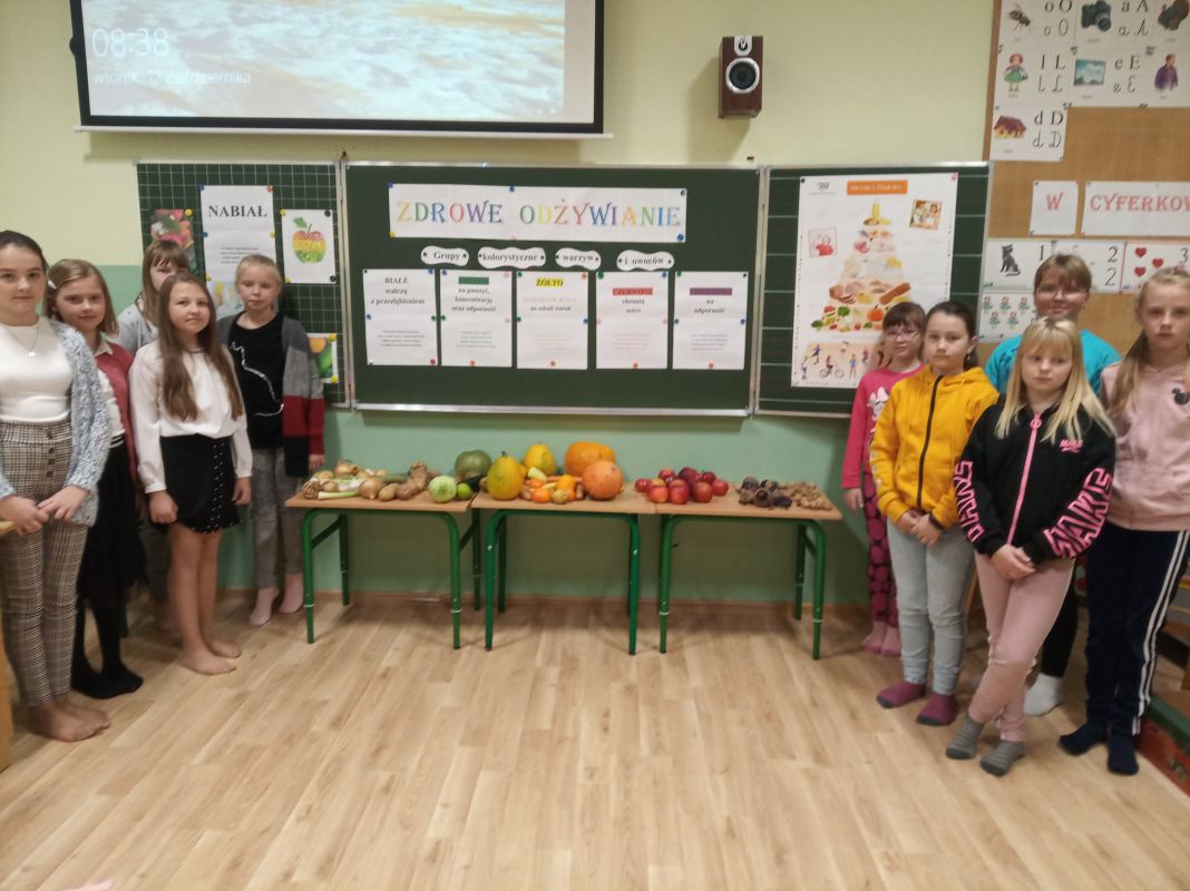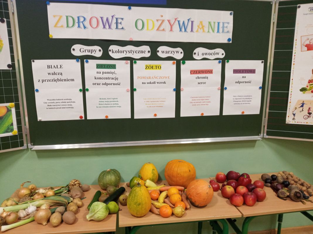 Na początku spotkania uczniowie zastanawiali się nad tym: Co to jest zdrowie? Co ma wpływ na nasze zdrowie? Co robić, a czego nie, aby być zdrowym? Co możemy jeść, a czego nie powinniśmy? W trakcie zajęcia dzieci miały możliwość zapoznania się z pięcioma grupami kolorystycznymi warzyw i owoców, które znajdowały się na wystawce. Warzywa i owoce pogrupowane były w następujący sposób: na białe- walczące z przeziębieniem; żółto – pomarańczowe – na sokoli wzrok; fioletowe – na odporność; zielone – na pamięć i koncentrację; czerwone – na ochronę serca. Podczas zajęcia uczniowie dowiedzieli się, iż ważnym aspektem zdrowia jest odpowiednio zbilansowana dieta, bogata w warzywa, owoce, nabiał oraz aktywność fizyczna.