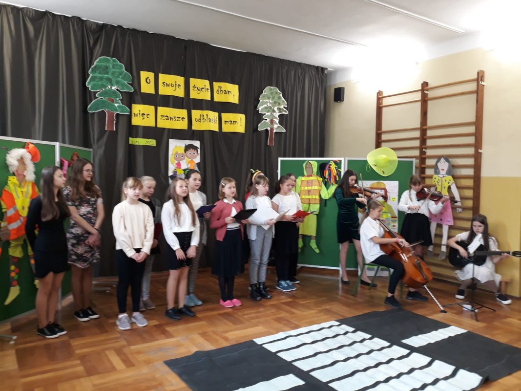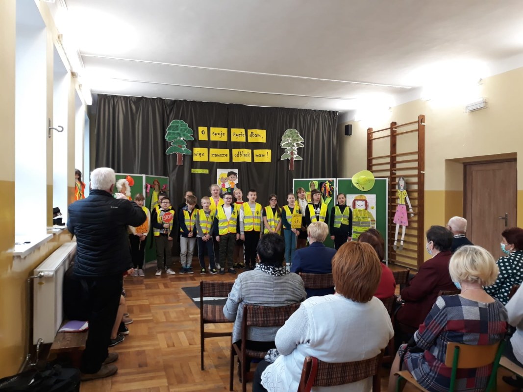 Seniorzy z zainteresowaniem wysłuchali odblaskowych piosenek i rymowanek przygotowanych przez uczniów naszej szkoły. W podziękowaniu artyści otrzymali od seniorów słodycze, a uczniowie podarowali klubowiczom pamiątkowe odblaski.