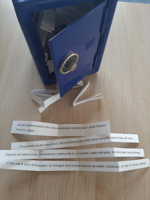 Pozytywne myślenie jest jak magnes. W zależności od jakości naszych myśli oraz wypowiadanych przez nas słów przyciągamy do siebie różne wydarzenia i ludzi. Codziennie stwarzamy swoją rzeczywistość za pomocą myśli, emocji, przekonań i oczekiwań. Jeśli myślimy pozytywnie, dostrzegamy pozytywne doświadczenia oraz ludzi, którzy myślą podobnie jak my. Pozytywne myślenie wpływa na jakość naszego zdrowia psychicznego. Dlatego by uczcić Światowy Dzień Zdrowia Psychicznego psycholog szkolny przygotował zbiór pozytywnych myśli, którymi częstowali się uczniowie, nauczyciele i pracownicy szkoły. Pozytywne sentencje wzbudzały uśmiech na twarzach wielu osób oraz poprawiały nastrój społeczności szkolnej.