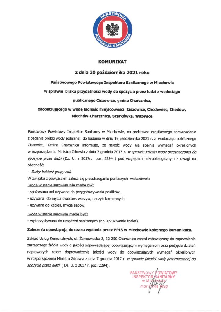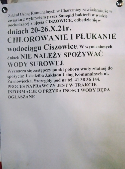 Jeden z czytelników przesłał nam ogłoszenie widniejące na słupie w Miechowie-Charsznicy, z którego wynika, iż Zakład Usług Komunalnych w Charsznicy zawiadamia, iż do 26 października 2021 r. potrwa chlorowanie i płukanie wodociągu Ciszowice. Do tego czasu nie należy spożywać wody surowej.