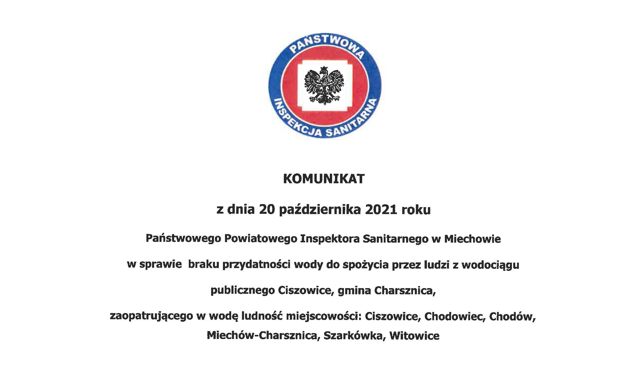 Powiatowy Inspektor Sanitarny w Miechowie wydał komunikat, iż woda pitna z ujęcia w Ciszowicach jest niezdatna nie tylko do picia, ale też do przygotowywania posiłków, mycia owoców, warzyw, naczyń, do kąpieli i mycia zębów.