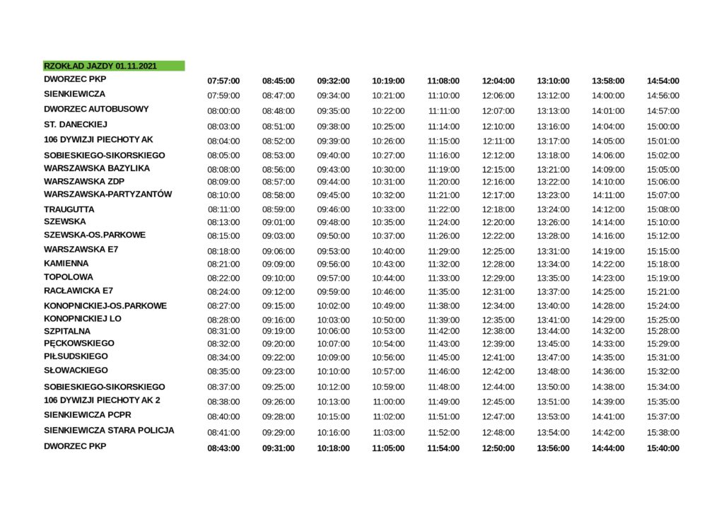 Rozkład jazdy obowiązujący w dniu 01.11.2021 r. będzie umieszczony wewnątrz autobusów oraz dostępny na stronie Zakładu Wodociągów i Kanalizacji w Miechowie sp. z o.o (www.zwikmiechow.pl) oraz na stronie gminy Miechów www.miechow.eu