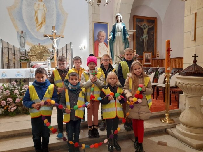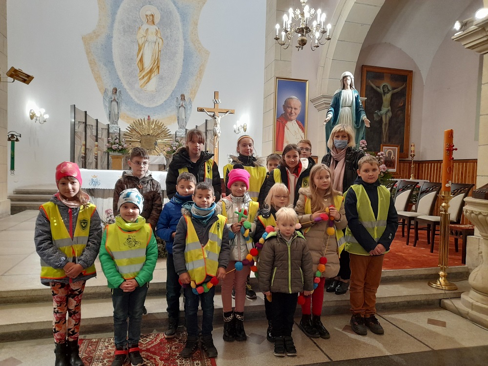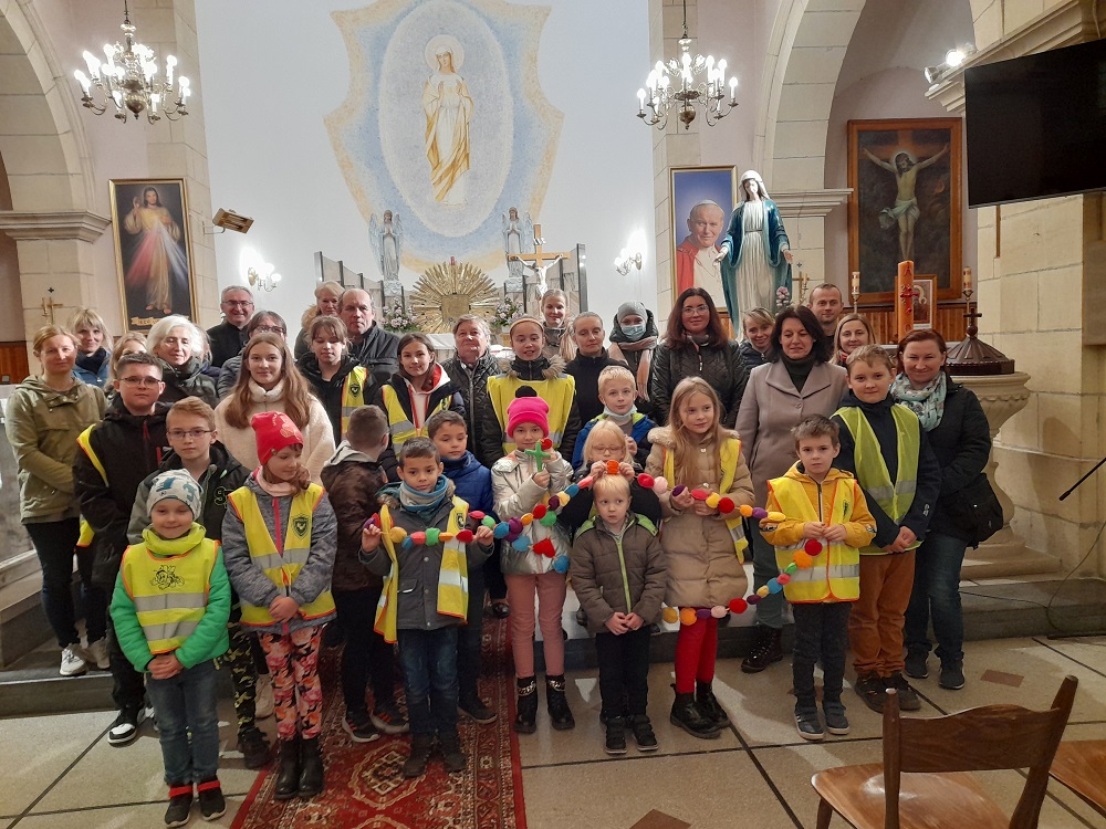 Dzieci i młodzież zebrali się w kościele parafialnym, 25 października ze swoimi dziadkami i rodzicami aby wspólnie modlić się na odblaskowym różańcu, który wykonali samodzielnie. W trosce o bezpieczeństwo uczestników tego wyjątkowego różańca, który prowadził ksiądz Maciej Stopiński uczniowie wręczyli odblaski poprawiające widoczność na drodze. Ta akcja doskonale uświadamia nam, że życie jest podstawowym dobrem człowieka i o to dobro powinniśmy dbać nie tylko dla siebie, ale i dla innych.