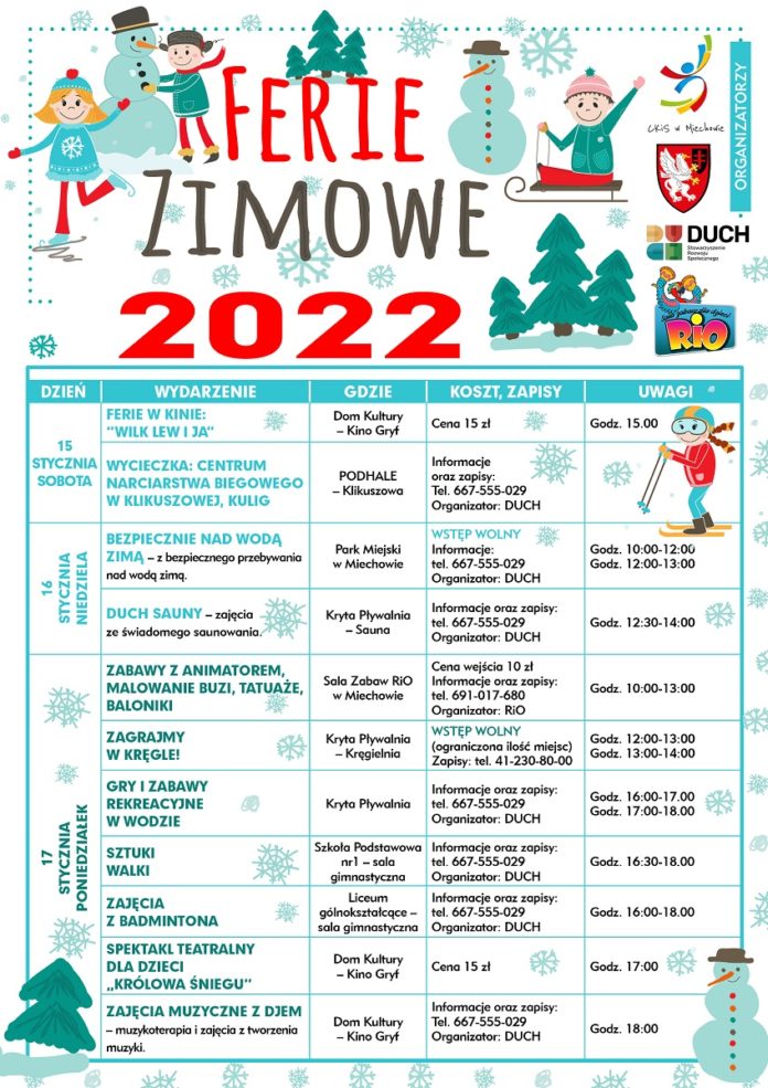 CKiSWiadomościMiechów Ferie Zimowe 2022 z CKiS Miechów Przez Krzysztof Capiga - 19 stycznia 2022 0 1714 FacebookTwitterPinterest Centrum Kultury i Sportu w Miechowie przygotowało bogaty program na Ferie 2022. Szczegóły na plakatach: [Pokaz zdjęć]