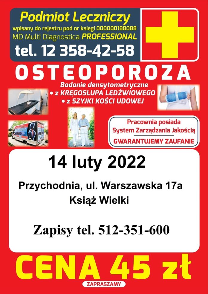 14 lutego 2022 r w Książu Wielkim, przy Ośrodku Zdrowia ul. Warszawska 17a, będzie można zbadać swoje kości pod kątem osteoporozy w mobilnej pracowni densytometrycznej – OSTEOBUS