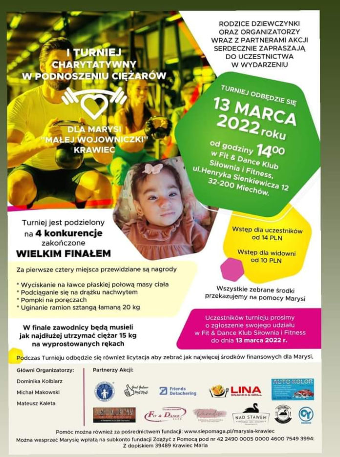 W niedzielę 13 marca 2022 r. w miechowskiej siłowni Fit & Dance przy ul. Sienkiewicza 12 (Galeria Miechowska) odbędzie się turniej charytatywny dla „Małej Wojowniczki” – Marysi Krawiec. Będzie można nie tylko zmierzyć się w konkurencjach siłowych, ale przede wszystkim wspomóc Marysię. Szczegóły na plakacie!