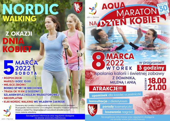 Centrum Kultury i Sportu w Miechowie zaprasza do aktywnego spędzenia Dnia Kobiet. Nordic Walking i Aquamaraton na pływalni to świetna forma spędzenia tego wyjątkowego święta. Szczegóły na plakatach.