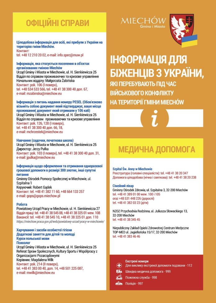 Całodobowa informacja Wojewody Małopolskiego dla osób uciekających z Ukrainy przed konfliktem zbrojnym Kontakt: tel. +48 12 210 20 02, e-mail: info.spec@muw.pl