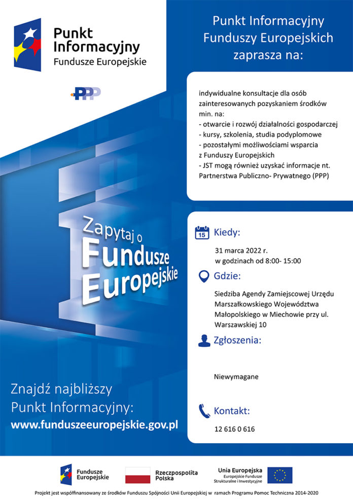 31 marca 2022r. w godzinach od 8:00 – 15:00 w siedzibie Agendy Zamiejscowej Urzędu Marszałkowskiego Województwa Małopolskiego w Miechowie przy ul. Warszawskiej 10 odbędzie się dyżur Punktu Informacyjnego Funduszy Europejskich.