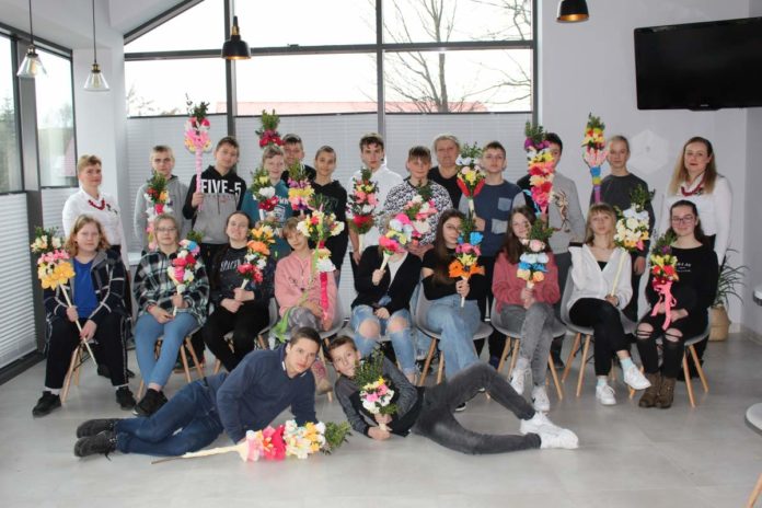 Włączając się w te przygotowania zorganizowaliśmy w Centrum Kultury spotkanie z Kołem Gospodyń Wiejskich z Rzeżuśni. Pani Marta i Pani Agata uczyły młodzież klasy VIIa jak wykonać palmę wielkanocną. W komponowanych palmach nie zabrakło tradycyjnych gałązek pochodzących od roślin wiecznie zielonych, czyli bukszpanu oraz kolorowych kwiatów wykonanych z papieru, bibuły i krepiny.