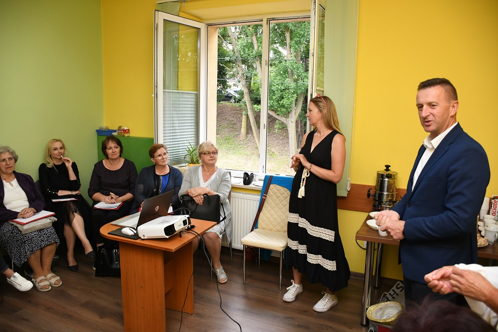 Uczestniczki szkolenia tj. 15 rodzin zastępczych, w tym 8 niezawodowych, 6 spokrewnionych i 1 zawodowa pełniąca funkcję pogotowia rodzinnego, w Powiatowym Centrum Pomocy Rodzinie w Miechowie, które sfinansowało wspomniane zajęcia, powitał Wicestarosta Paweł Osikowski z Kierownikiem PCPR – Januszem Patyną.