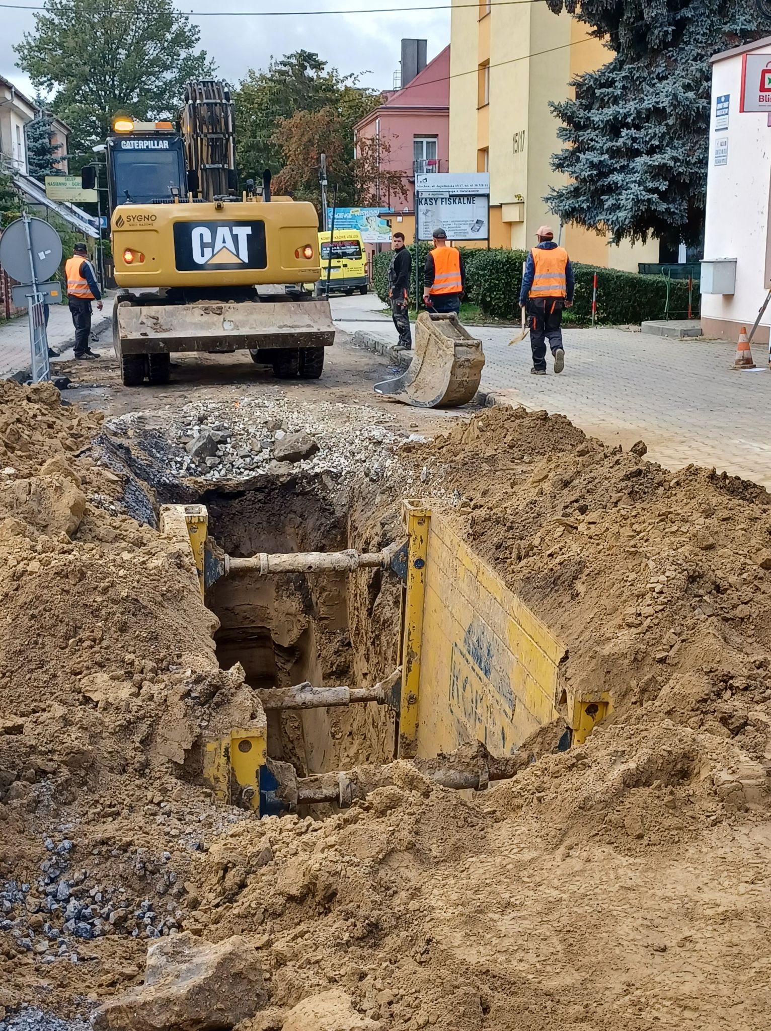W ramach inwestycji drogowej w centrum Miechowa prowadzone są roboty ziemne. Wykonano frezowanie nawierzchni bitumicznej oraz fragment odcinka kanalizacji deszczowej.