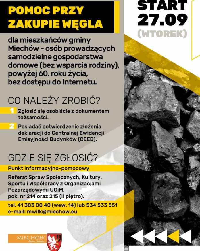 Od 27 września (wtorek) Gmina Miechów rozpoczyna wypłatę tzw. dodatków węglowych. Jednocześnie, obserwując szczególnie trudną sytuację osób starszych, samotnych i bez dostępu do Internetu, Gmina Miechów podejmie próbę pomocy w zakupie węgla Mieszkańcom.