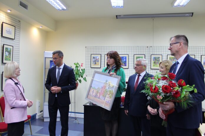 Przedstawiciele samorządu gminnego wręczyli kierującej przez ostatnie siedemnaście lat biblioteką Pani Marii Słuszniak obraz przedstawiający zabytkową część miasta, z Placem Kościuszki oraz budynkiem bibliotecznym na czele.