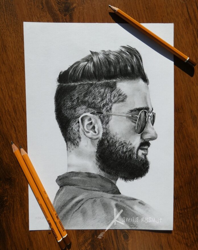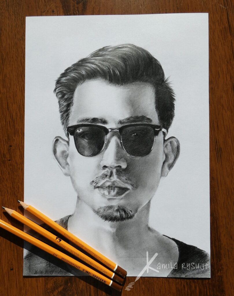 Rysowanie ciemnych włosów wymaga nakładania wielu warstw ołówka, żeby uzyskać odpowiednio intensywny odcień. Jest przy tym więcej pracy niż przy jasnych, ale ja sama wolę portretować osoby