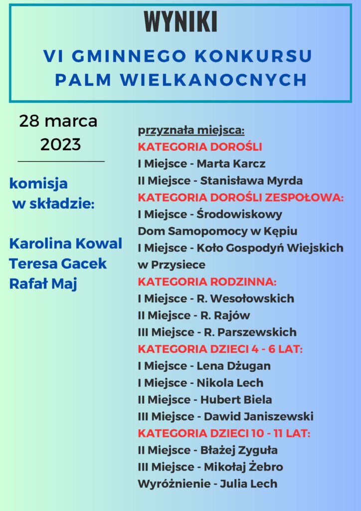 Niedziela Palmowa 2023 w Kozłowie przebiegła w atmosferze przygotowującej do obchodów najważniejszych w tradycji katolickiej świat Wielkiej Nocy. Obrzęd przejazdu Jezusa i procesja z palmami na stałe wpisały się w kalendarz kozłowskich uroczystości. Imprezie towarzyszyło rozdanie nagród z VI Gminnego Konkursu Palm Wielkanocnych.