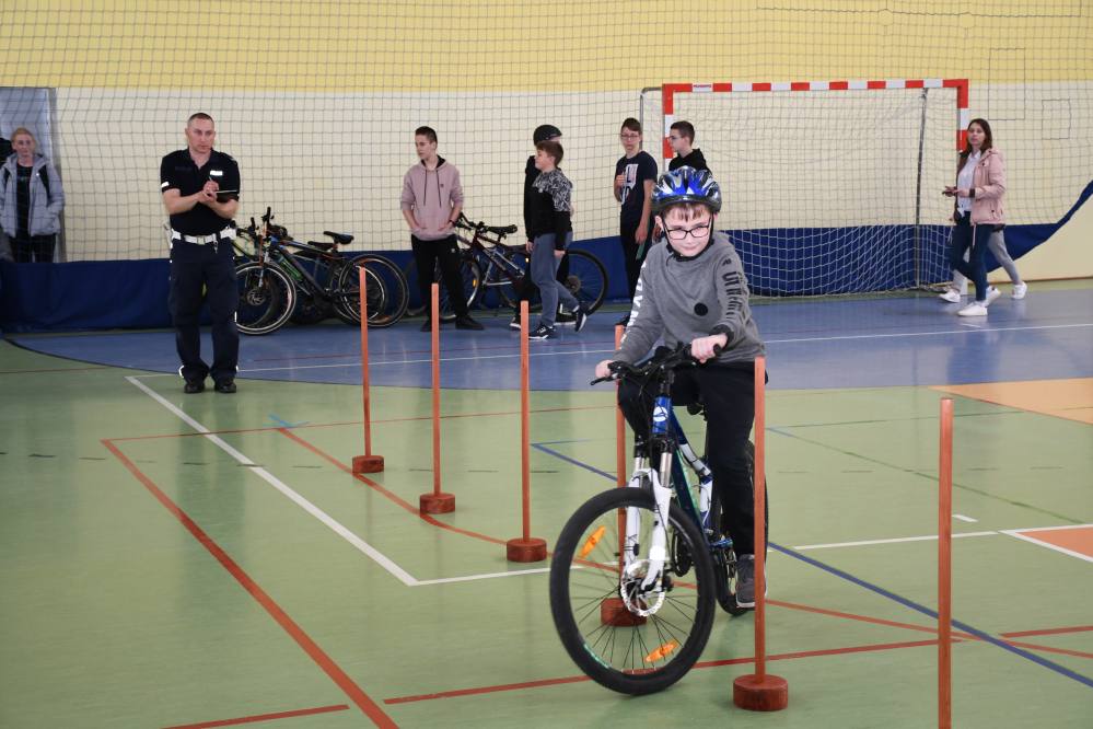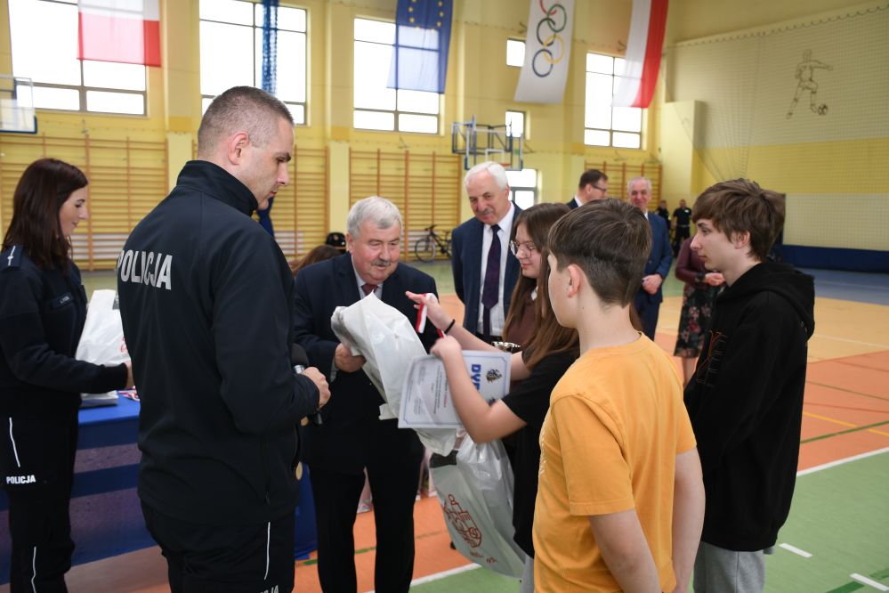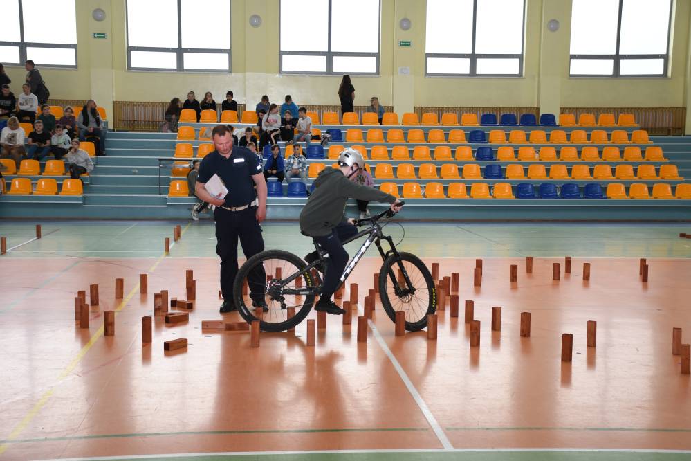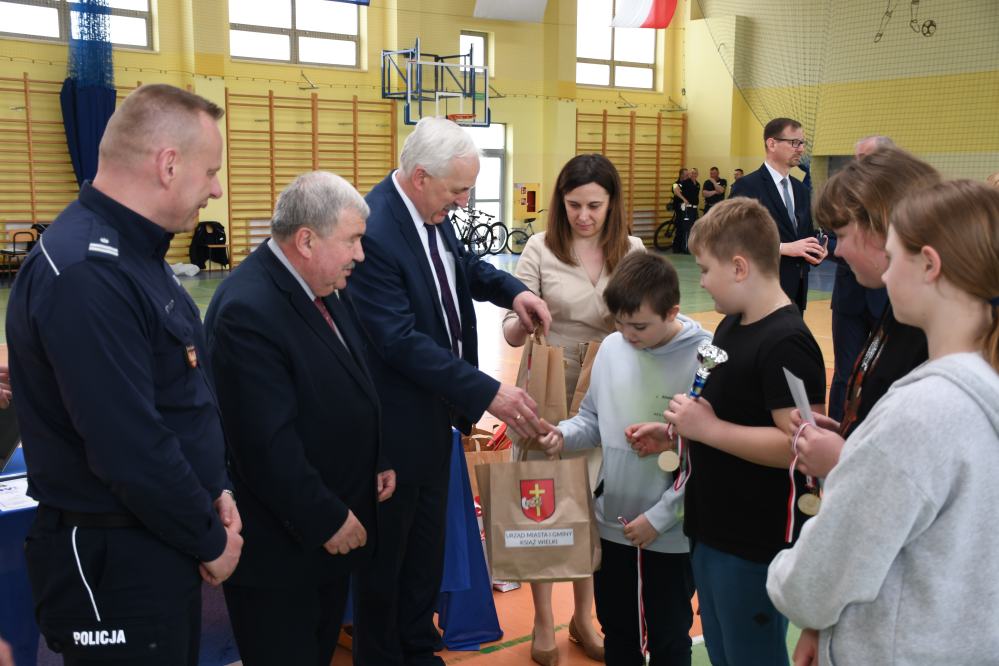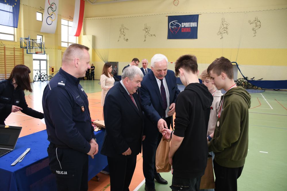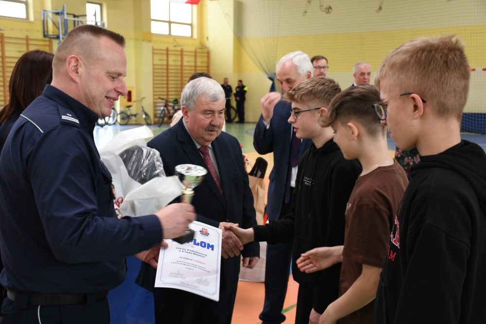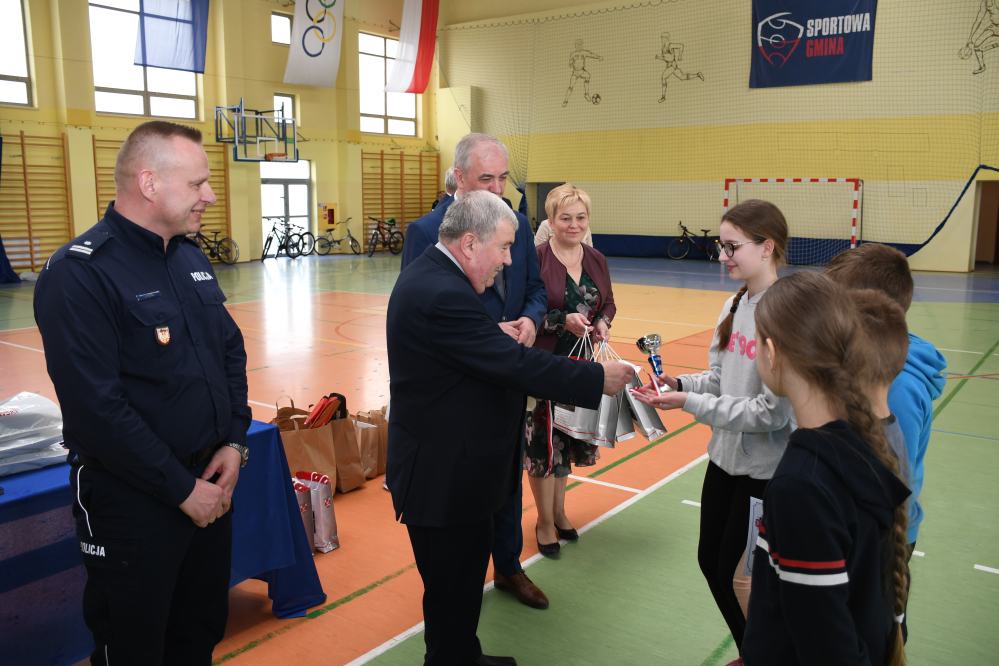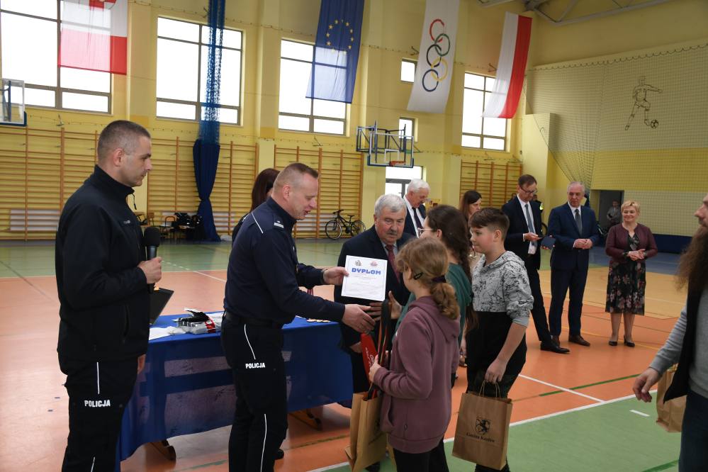 W części praktycznej uczniowie wykazywali się umiejętnością jazdy na rowerze podczas pokonywania przeszkód ustawionych na torze. Zacięta rywalizacja uczestników konkursu towarzyszyła do samego końca. Po podliczeniu wszystkich punktów z testów i jazdy na rowerze po torze przeszkód, podsumowania zmagań i wręczenia nagród dokonali: Starosta Miechowski Jacek Kobyłka, Komendant Powiatowy Policji podinsp. Jacek Rosół, a także włodarze samorządów, którzy wręczali upominki dla reprezentujących ich drużyn. Następujące miejsca: