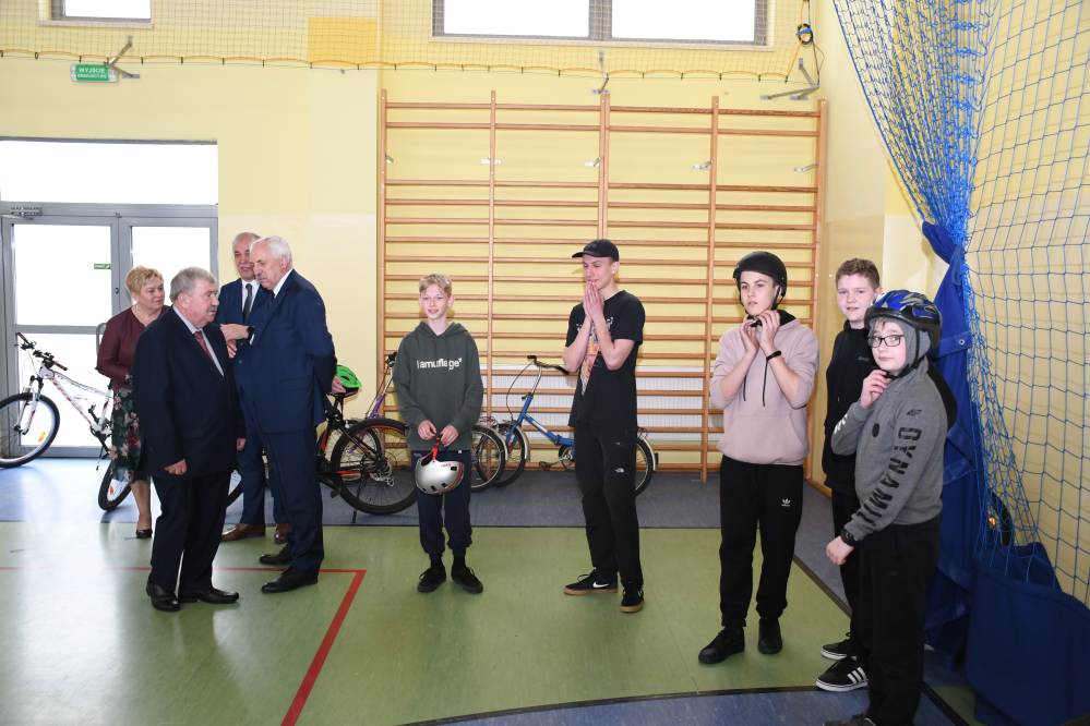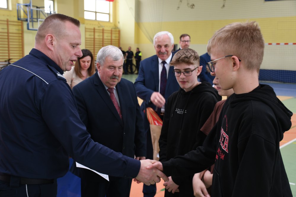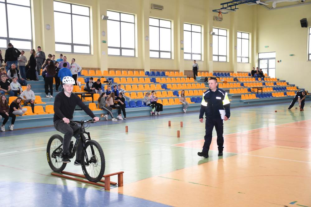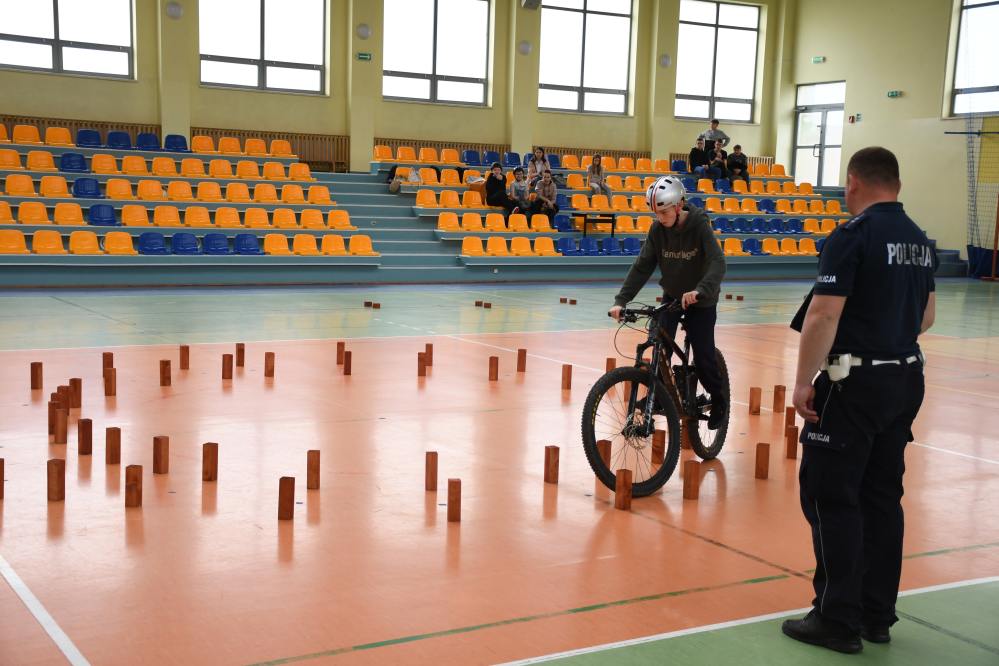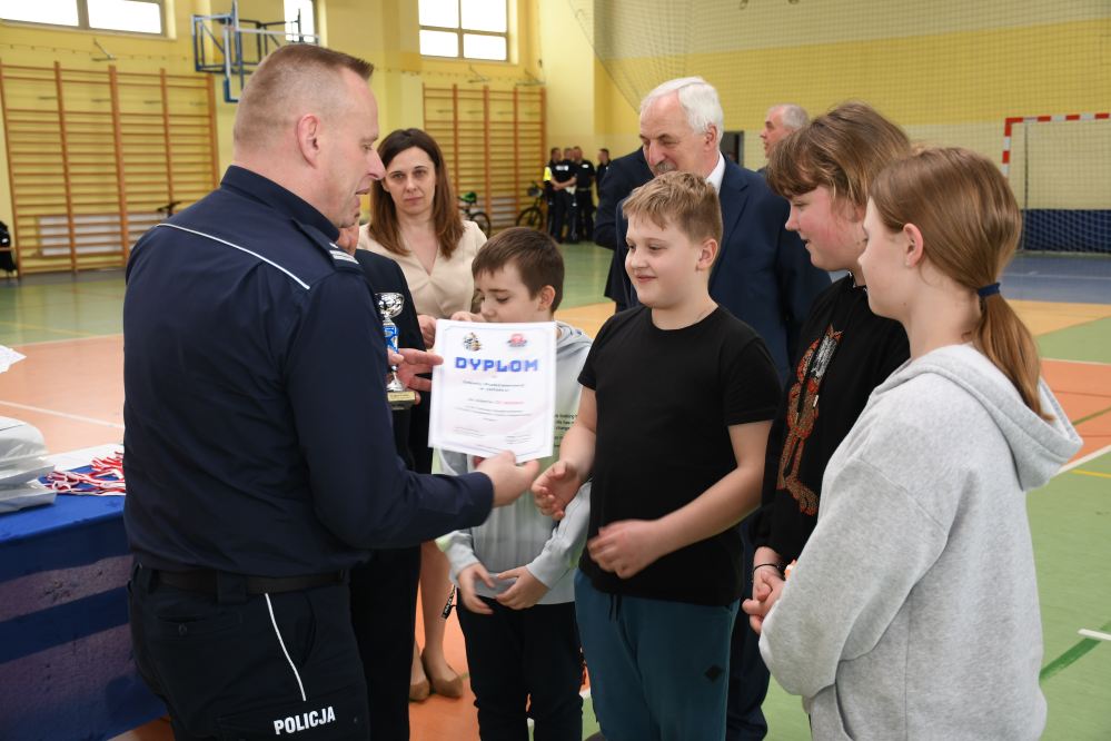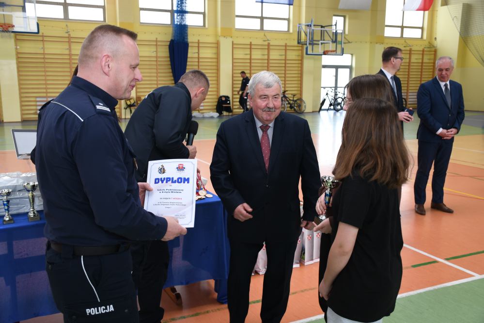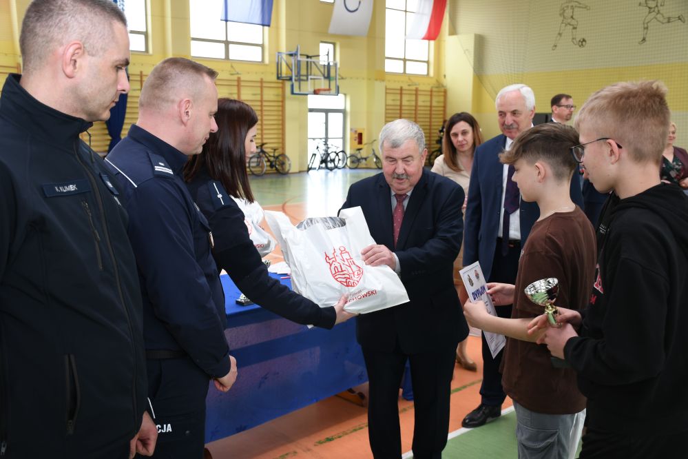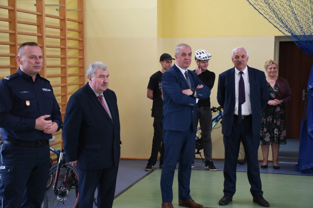 W części praktycznej uczniowie wykazywali się umiejętnością jazdy na rowerze podczas pokonywania przeszkód ustawionych na torze. Zacięta rywalizacja uczestników konkursu towarzyszyła do samego końca. Po podliczeniu wszystkich punktów z testów i jazdy na rowerze po torze przeszkód, podsumowania zmagań i wręczenia nagród dokonali: Starosta Miechowski Jacek Kobyłka, Komendant Powiatowy Policji podinsp. Jacek Rosół, a także włodarze samorządów, którzy wręczali upominki dla reprezentujących ich drużyn. Następujące miejsca: