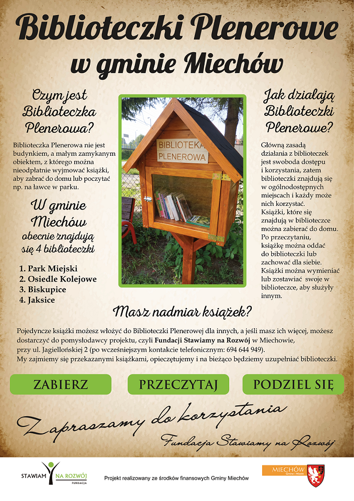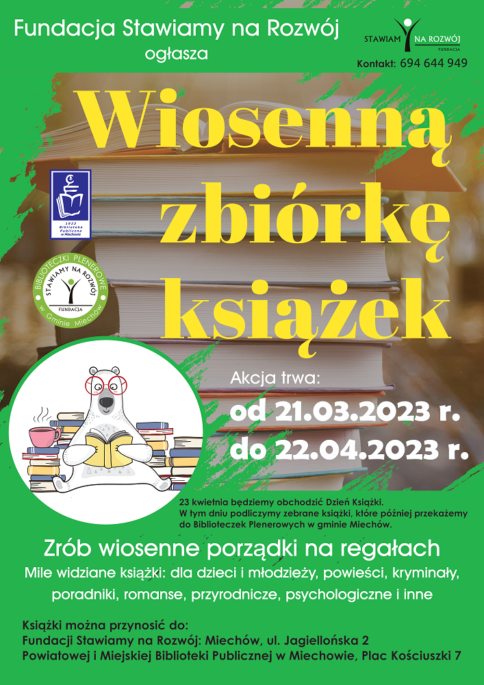 Mimo, że „Wiosenna zbiórka książek” oficjalnie się zakończyła, to przez cały rok można przynosić książki zarówno do siedziby fundacji, która znajduje się w Miechowie, ul. Jagiellońska 2, lub bezpośrednio do biblioteczek plenerowych: w Parku Miejskim, na os. Kolejowym, w Biskupicach i Jaksicach, a także do otwartej biblioteczki w Powiatowej i Miejskiej Bibliotece Publicznej, znajdującej się na Placu Kościuszki 7.