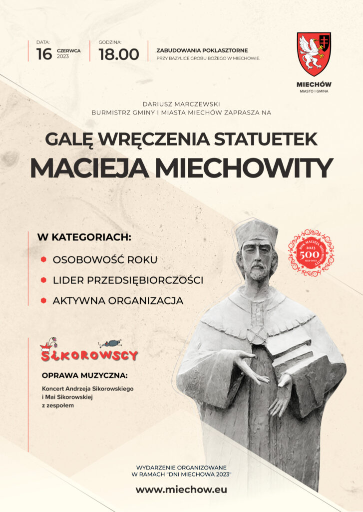 Tegoroczne Dni Miechowa już w najbliższy weekend! Święto miasta oficjalnie rozpocznie uroczysta Gala Wręczenia Statuetek Macieja Miechowity – corocznych nagród Burmistrza Miechowa, przyznawanych w trzech kategoriach: Osobowość Roku, Lider Przedsiębiorczości oraz Aktywna Organizacja. Odbędzie się ona w piątek 16 czerwca o godz. 18.00 w Zabudowaniach Poklasztornych. Podczas uroczystości odbędzie się koncert Andrzeja Sikorowskiego i Mai Sikorowskiej z zespołem.