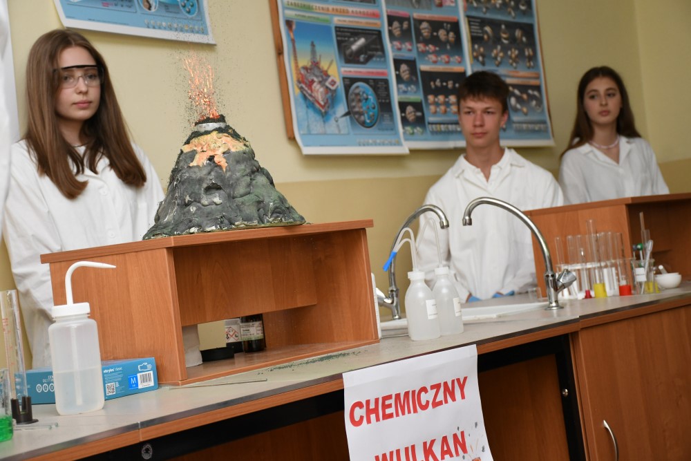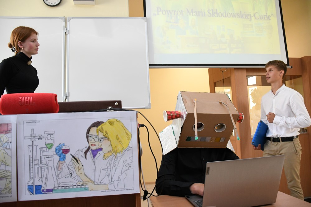 Na tę okazję młodzież „Ogólniaka” z nutką humoru zaprezentowała swą wiedzę i doświadczenia chemiczne pod okiem „przybyłych z przeszłości” wybitnych uczonych – Marii Skłodowskiej-Curie i szalonego Alberta Einsteina.