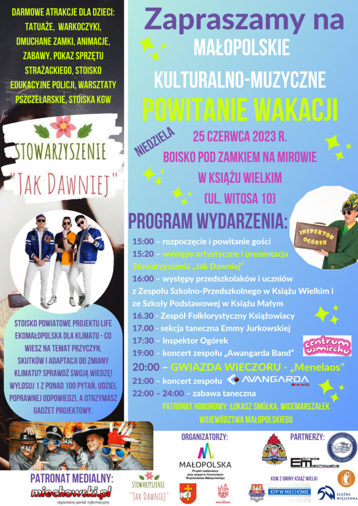 Wicemarszałek Małopolski Łukasz Smółka, Stowarzyszenie „Jak Dawniej”, Burmistrz Gminy i Miasta Książ Wielki Marek Szopa oraz Zarząd Powiatu Miechowskiego zapraszają w niedzielę 25 czerwca na Małopolskie kulturalno-muzyczne powitanie wakacji. Organizatorzy na placu koło Zamku na Mirowie w Książu Wielkim przygotowali wiele atrakcji, dla dzieci i nie tylko.