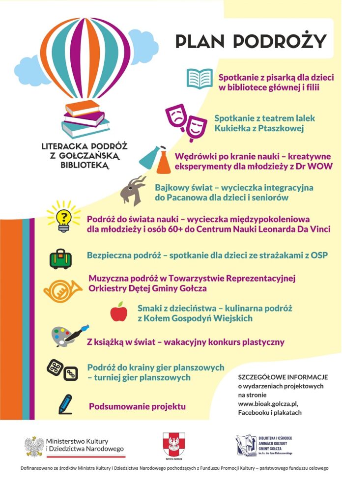 Projekt pod nazwą „Literacka podróż z gołczańską biblioteką „ to cykl wydarzeń kulturalnych w Gminie Gołcza związanych z książką.