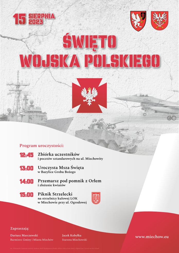 Burmistrz Gminy i Miasta Miechów Dariusz Marczewski oraz Starosta Miechowski Jacek Kobyłka zapraszają na tegoroczne Obchody Święta Wojska Polskiego w dniu 15 sierpnia w Miechowie.