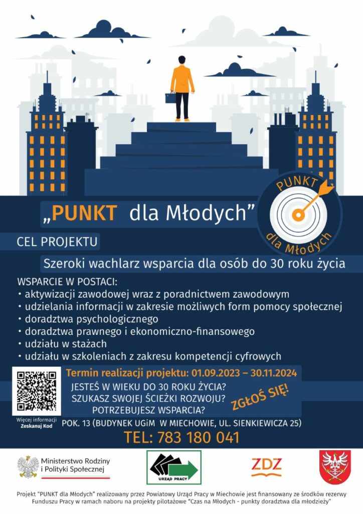 W piątek 22 września 2023 r. Powiatowy Urząd Pracy w Miechowie oficjalnie otworzył „PUNKT dla Młodych” (do 30 roku życia), w ramach pilotażowego projektu  pod nazwą „Czas na Młodych – punkty doradztwa dla młodzieży”. W otwarciu punktu uczestniczyli: Starosta Powiatu Miechowskiego Jacek Kobyłka, Wicestarosta Paweł Osikowski, Przewodniczący Rady Powiatu Miechowskiego Krzysztof Świerczek, dyr. Centrum Kształcenia Zawodowego w Miechowie Ewa Kowalczyk-Uchto, dyr. PUP w Miechowie Tomasz Mucha oraz jego zastępca – Halina Zięba.