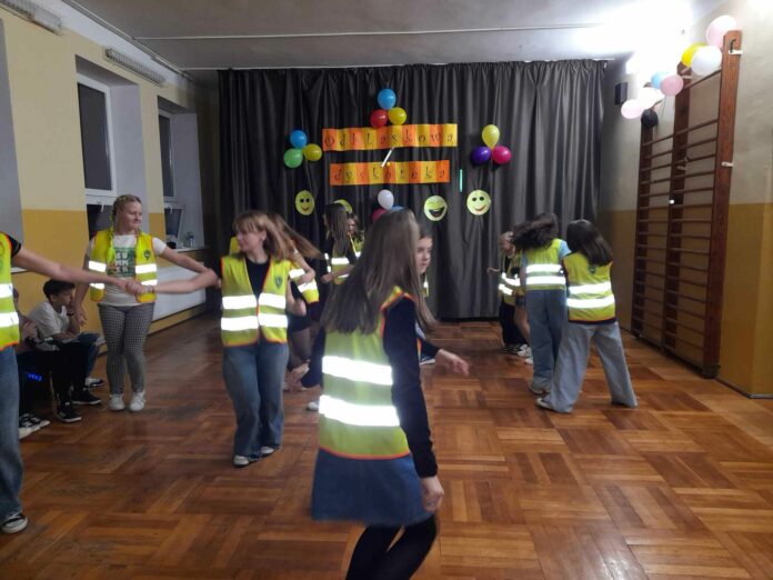 Wszyscy bawili się doskonale do różnorodnej muzyki. Na zakończenie wspólnej zabawy uczniowie na placu szkolnym utworzyli krąg, który symbolizował odblask. Miał on utrwalić zwyczaj noszenia odblasków niezależnie od wieku.