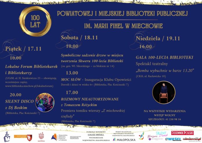 Szanowni Państwo! Serdecznie zapraszamy na uroczystości związane z jubileuszowymi obchodami  stulecia istnienia Powiatowej i Miejskiej Biblioteki Publicznej w Miechowie.