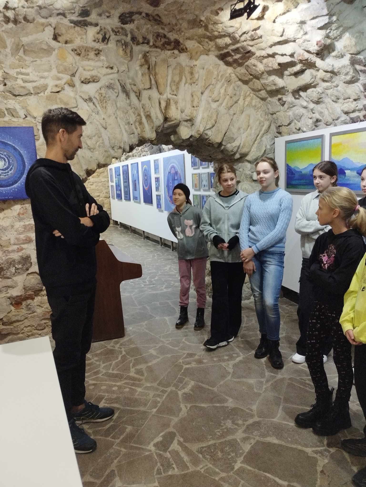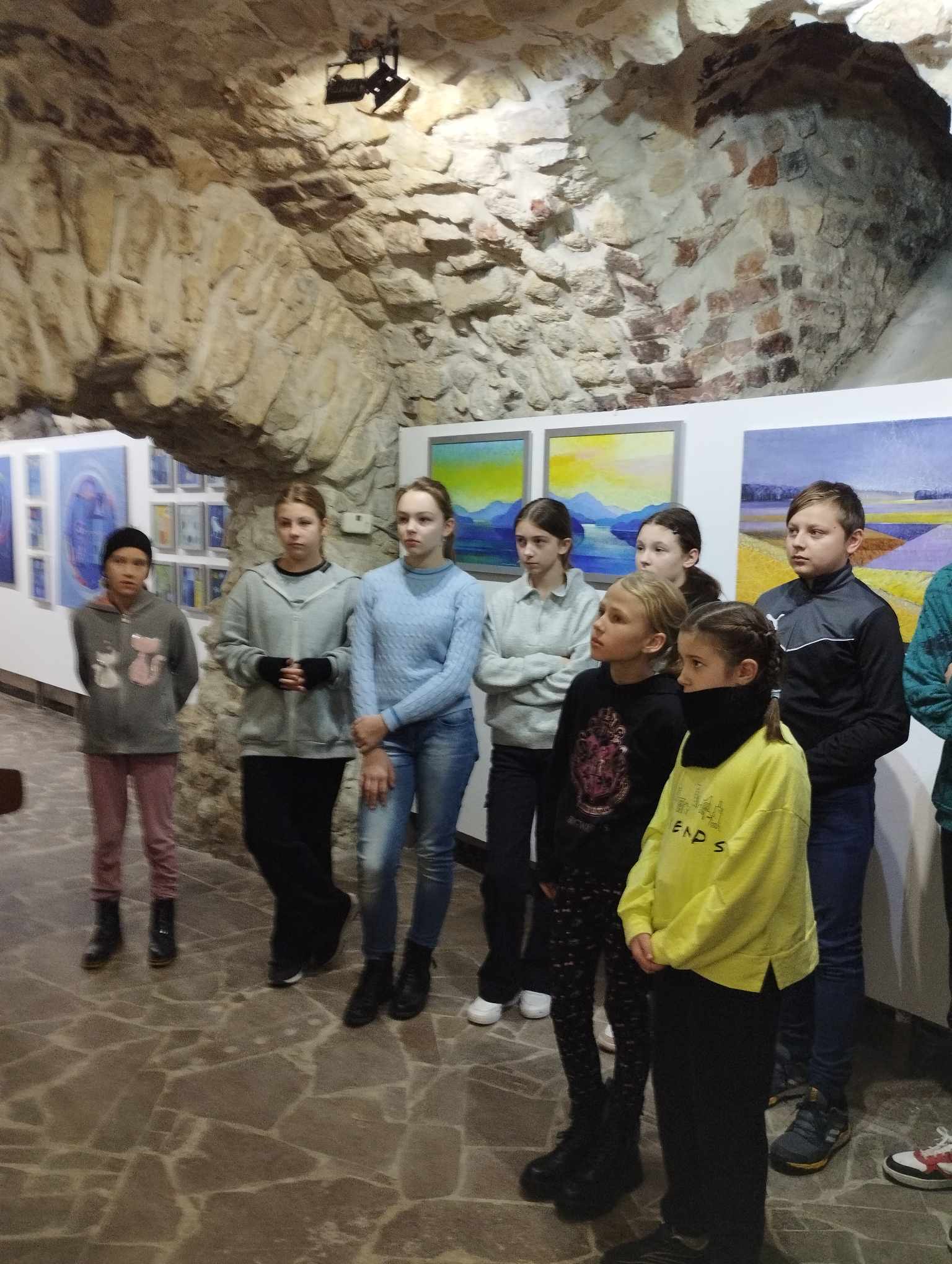 Najpierw obejrzeli wystawę prac malarskich w Galerii u Jaksy. Wystawa dotyczyła prac autorstwa p. Małgorzaty Maćkowiak pt.” Mapy niebieskie i inne obrazy”. (Jest to krakowska artystka zajmująca się malarstwem monumentalnym, rysunkiem i ilustracją dla dzieci a także tworzącą lalki artystyczne).