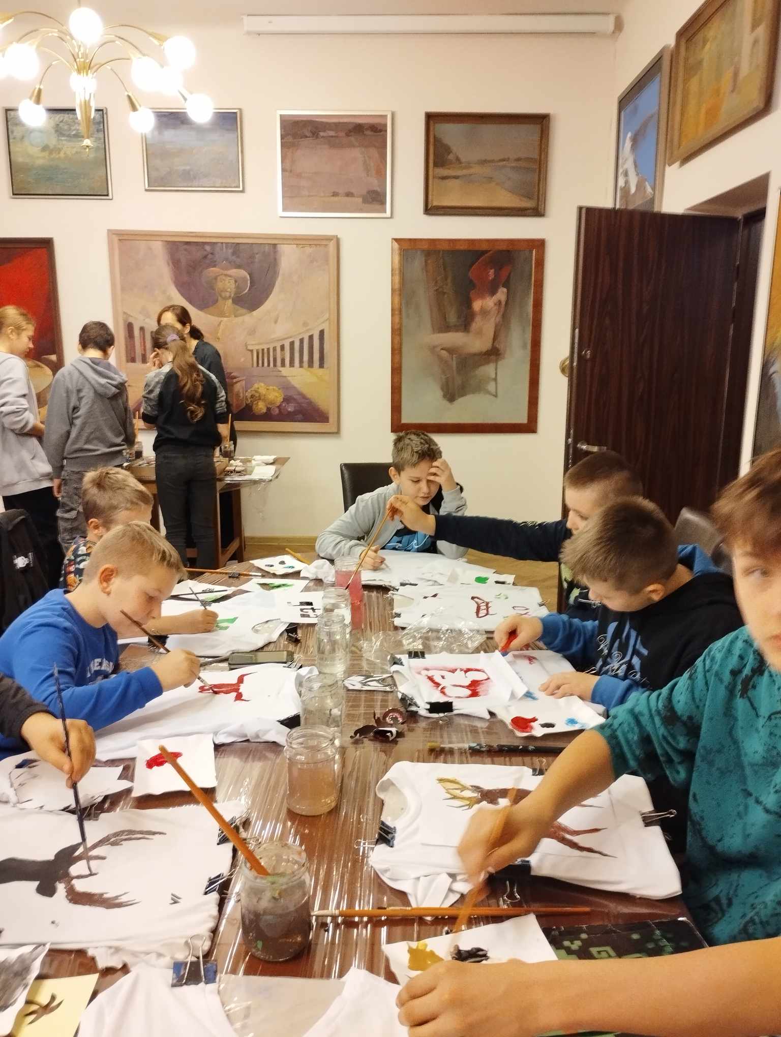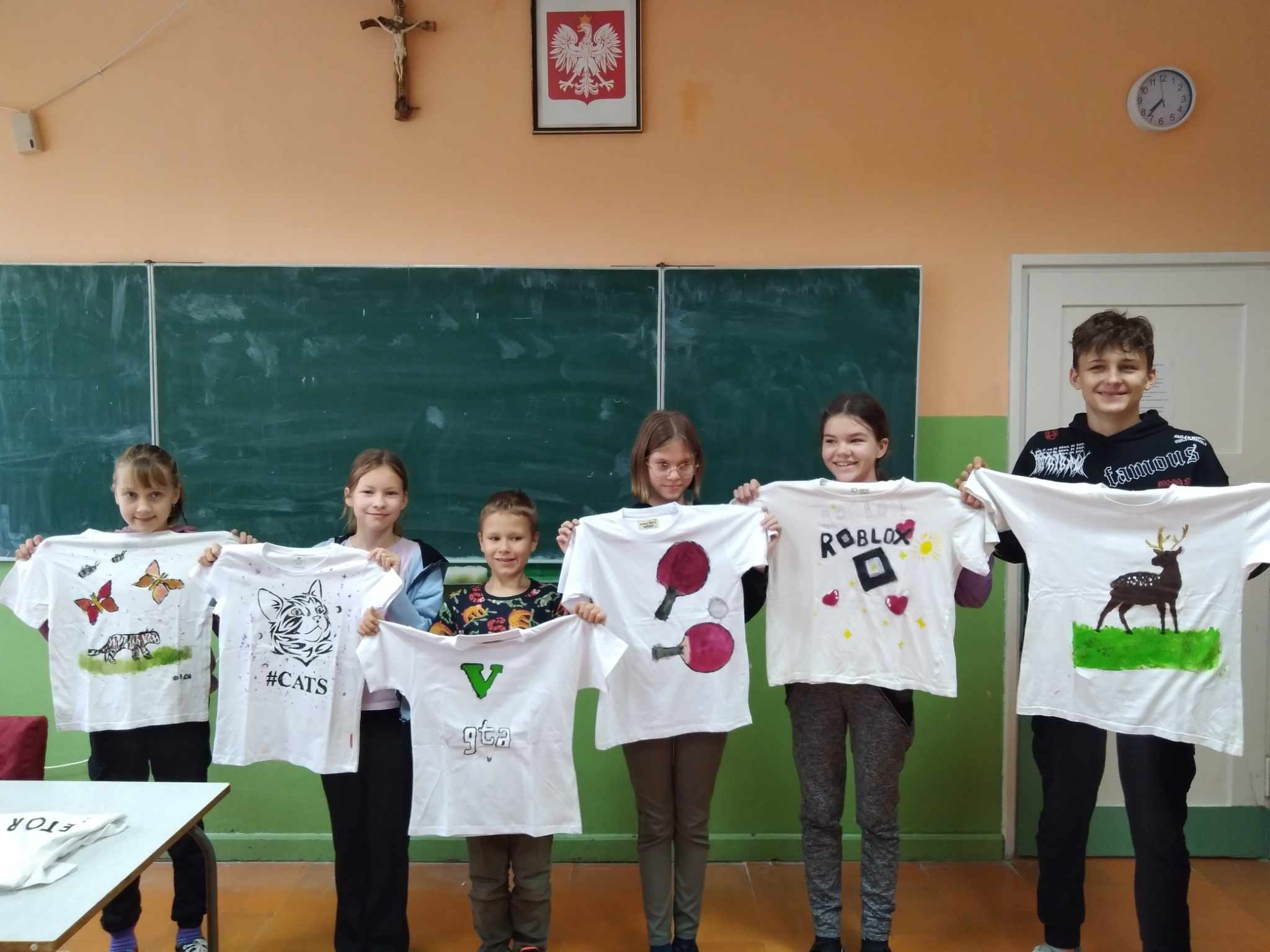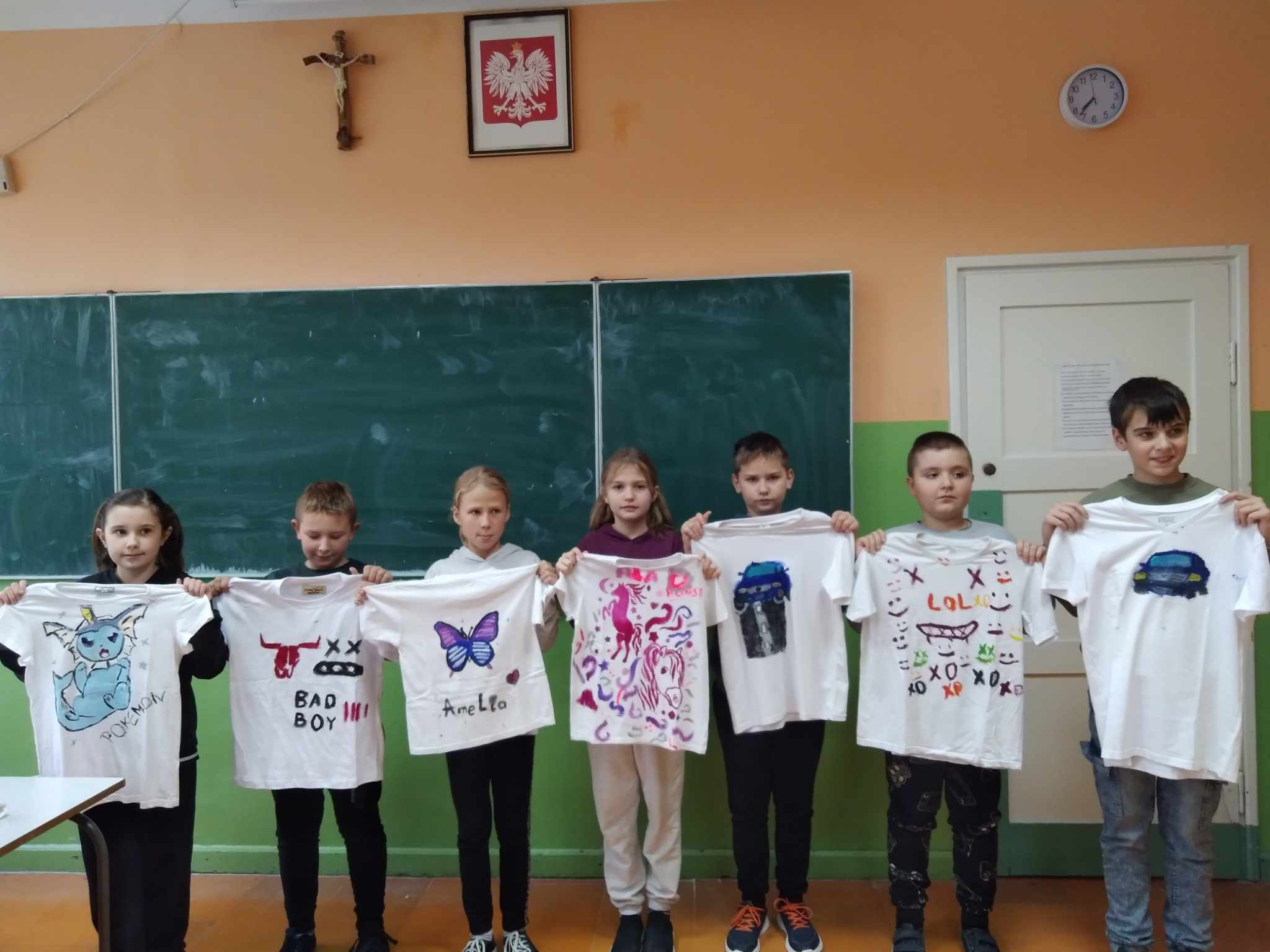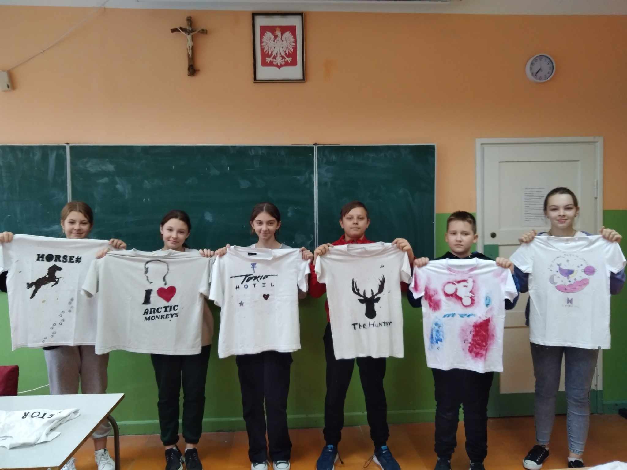 Głównym celem warsztatów było namalowanie na koszulce według własnego pomysłu wzoru z wykorzystaniem szablonu i specjalnych farb do malowania tkanin. Uczniowie sami przygotowali swoje szablony i w zaskakującym tempie personalizowali swoje koszulki. Na jednych pojawiły się barwne konie, motyle, na innych samochody i inne wzory.