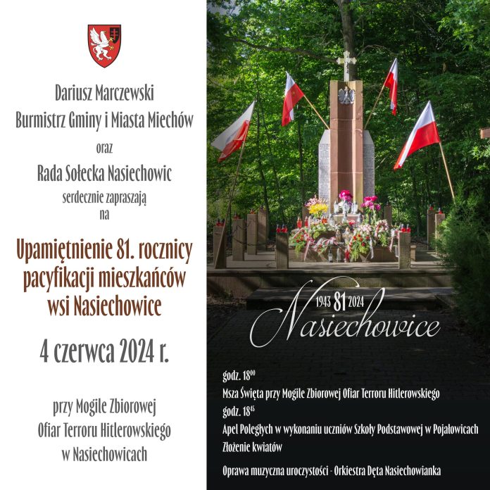 Burmistrz Gminy i Miasta Miechów Dariusz Marczewski oraz Rada Sołecka Nasiechowic serdecznie zapraszają na uroczystość Upamiętnienia 81. rocznicy Pacyfikacji Mieszkańców Nasiechowic, która odbędzie się 4 czerwca br.