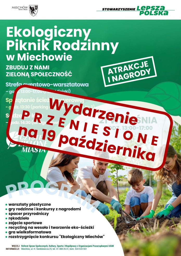 Informujemy, że z uwagi na wprowadzony stan klęski żywiołowej na terenach dotkniętych powodzią, wydarzenie pn. „Ekologiczny Piknik Rodzinny w Miechowie” zaplanowane na 21 września odbędzie się w sobotę 19 października br.