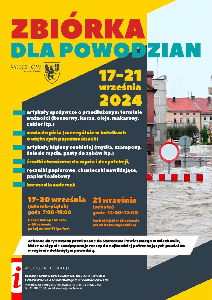 Burmistrz Gminy i Miasta Miechów ogłasza zbiórkę darów dla powodzian, która odbędzie się w dniach 17-21 września 2024 r.