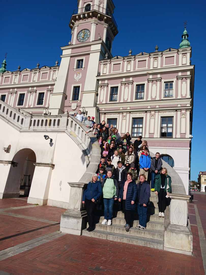 Celem wyprawy uczniów był jednak Zamość (miasto założone przez Jana Zamojskiego), którego zwiedzanie rozpoczęto od Twierdzy Zamość. W towarzystwie przewodnika młodzi turyści przespacerowali się wzdłuż fortyfikacji, zwiedzili trasę podziemną, obejrzeli filmy o historii tego miejsca. Ponadto wyszli na Taras Widokowy Nadszańca skąd rozpościerała się panorama miasta. Niewątpliwą atrakcją pobytu w twierdzy był strzał z armaty, którego to zaszczytu dostąpiła jedna z uczennic. Swoje opowieści o historii miasta przewodnik okraszał różnymi ciekawostkami, m. in. o historii „szwedzkiego stołu”. Perełką Zamościa okazał się renesansowy Ratusz z charakterystycznymi schodami, obok którego wspaniale prezentują się odnowione kamienice ormiańskie. Uczniowie mieli okazję zobaczyć także dzielnicę żydowską, pomnik fundatora miasta (Jana Zamojskiego), pałac Zamojskich oraz zamojską Katedrę. Przy jednej z uliczek przylegających do Rynku dostrzegli kamienicę, w której mieszkał znany polski piosenkarz Marek Grechuta.