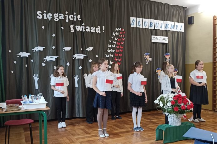 Witając zebranych, dyrektor szkoły, Małgorzata Borycka, przypomniała pokrótce historię szkoły, a następnie przyjęła w poczet pełnoprawnych uczniów 11 pierwszoklasistów, którzy po akcie pasowania otrzymali tarcze, legitymacje szkolne oraz pamiątkowe książki. Z kolei uczniowie I klasy wystąpili z okolicznościową częścią artystyczną, przygotowaną pod opieką wychowawczyni Małgorzaty Kusarek.