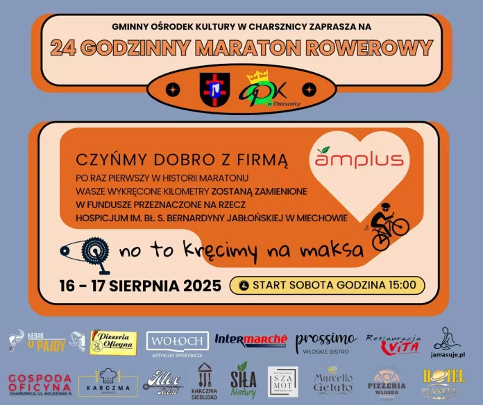 W dniach 16/17 sierpnia 2025 roku już po raz szósty GOK w Charsznicy zaprasza wszystkich miłośników jazdy na rowerze do udziału w „24-godzinnym Maratonie Rowerowym”. Trasę o długości 4 km (1 okrążenie) można pokonywać dowolną ilość razy w wybranym przez siebie przedziale czasowym od godz. 15:00 w sobotę 16 sierpnia do godz. 15:00 w niedzielę 17 sierpnia.